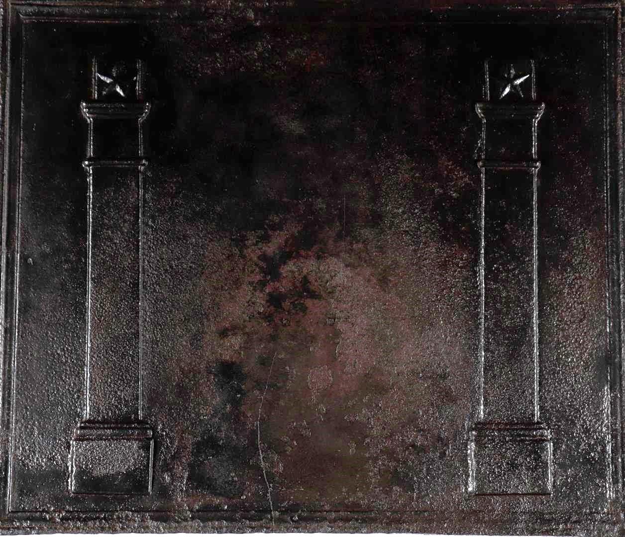 A black painted cast iron fireplace plate with two columns depicted on it.