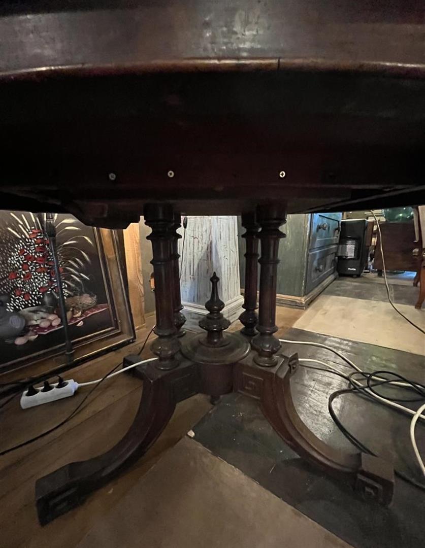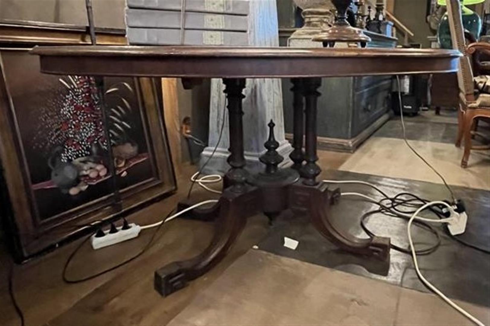A Victorian coffee table with oval top covered with burl walnut veneer. Late...