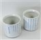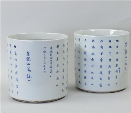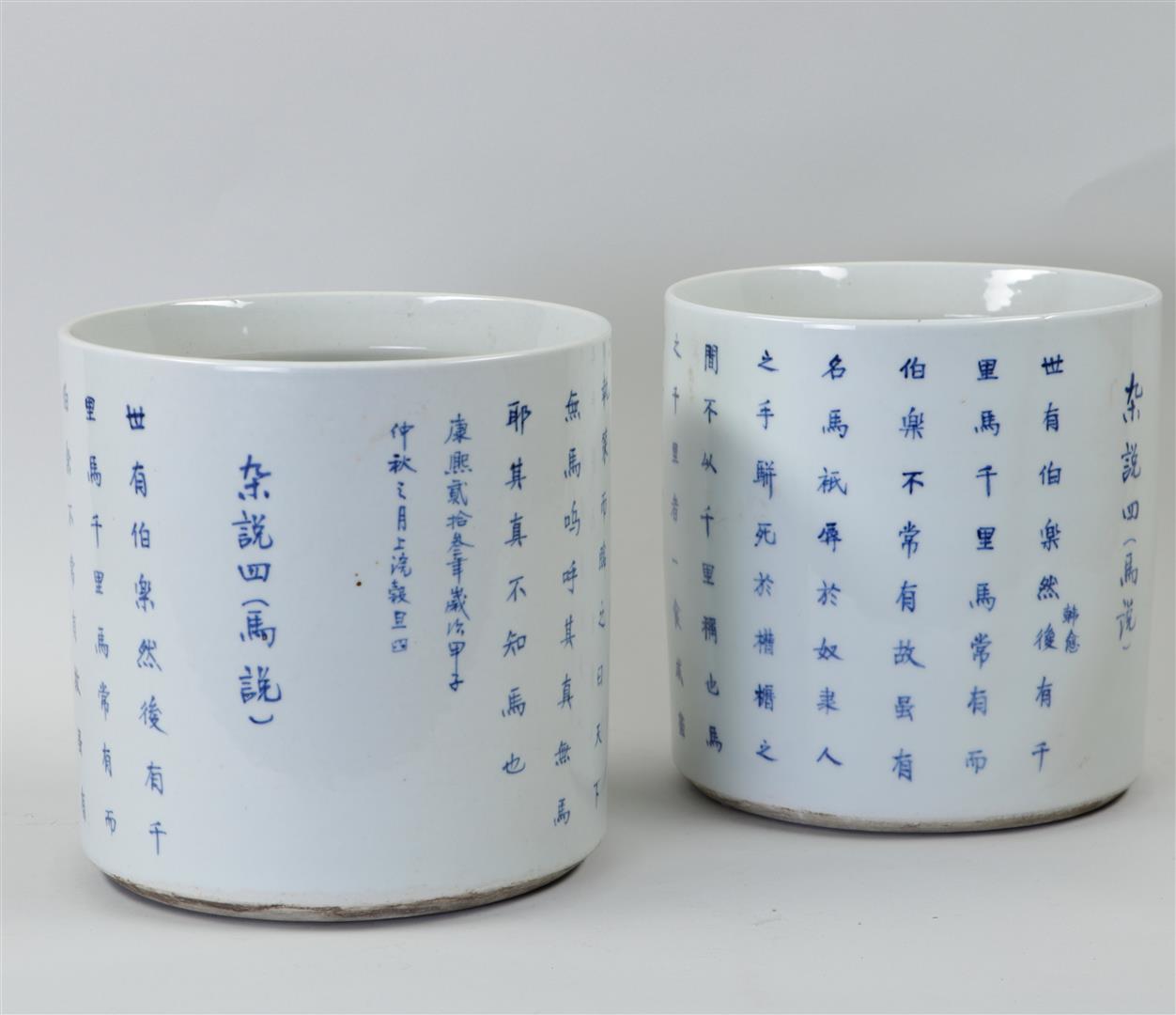 Two Chinese porcelain brush pots decorated with Chinese characters.