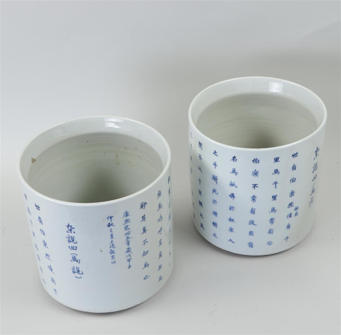 Two Chinese porcelain brush pots decorated with Chinese characters. 30 x 20 cm.