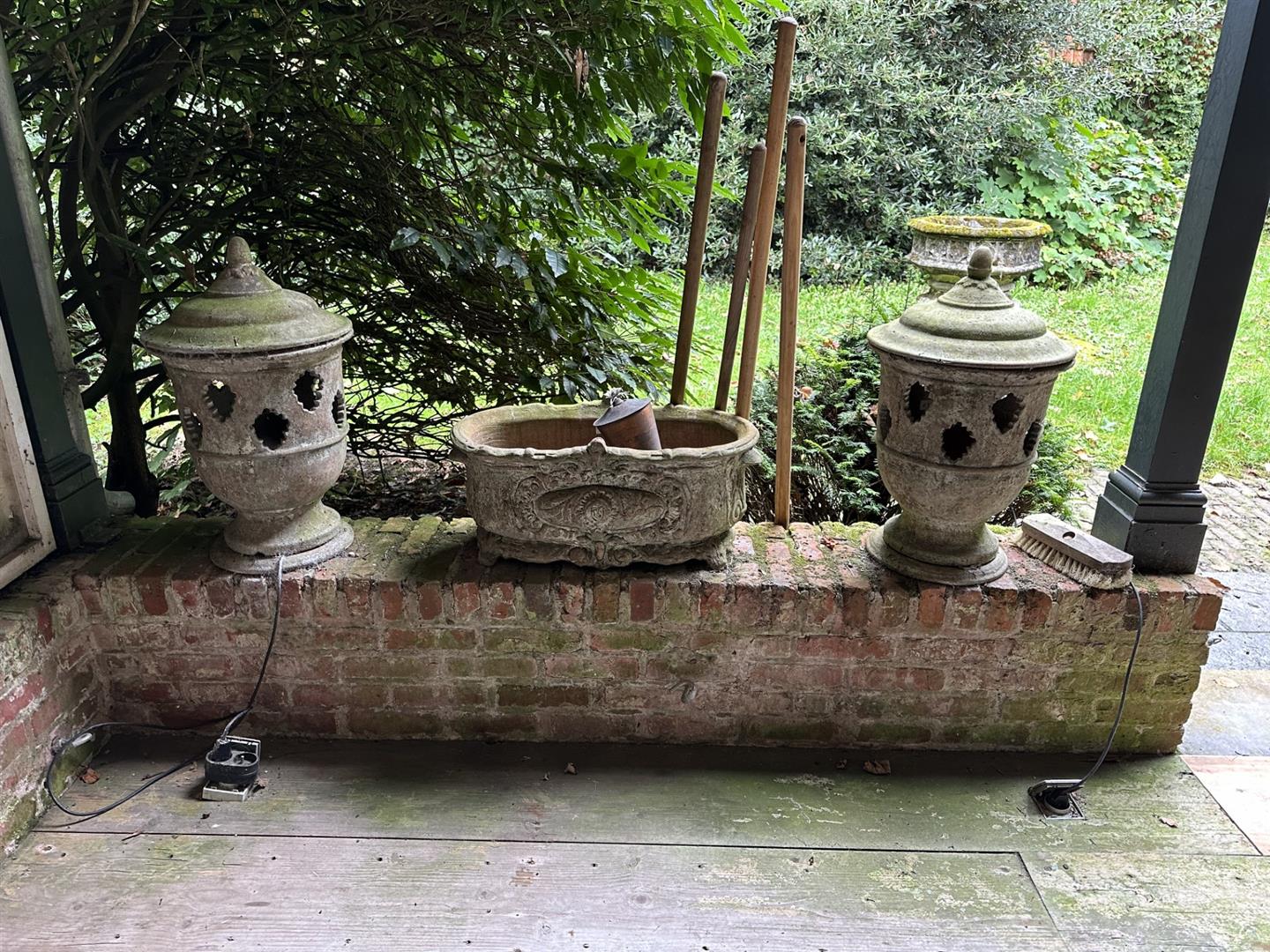 A three-piece set of two lanterns and a jardiniere. The jardiniere is from the Ampholia Anduze earthenware factory, Tornac, France. Height lanterns 60 cm., Jardiniere: 25 x 60 cm. (left side of the terrace).