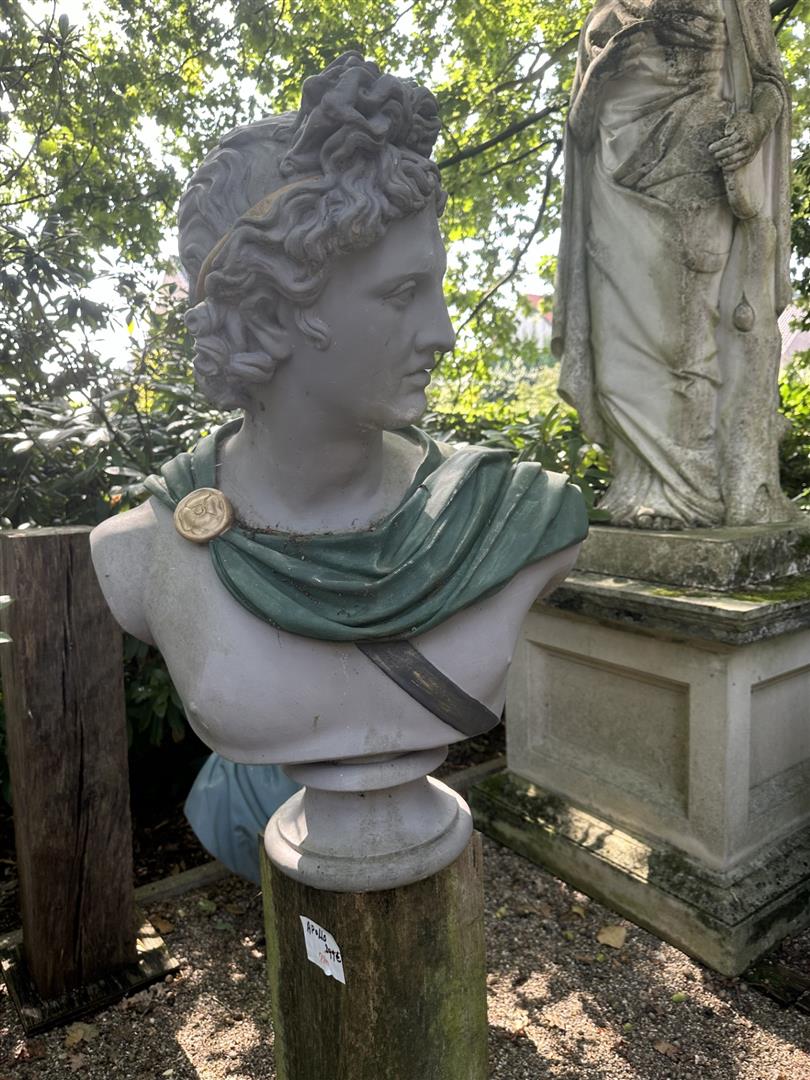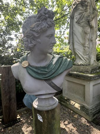 A polychrome (green and gold) bust of the Apollo Belvedere. Height: 83 cm.