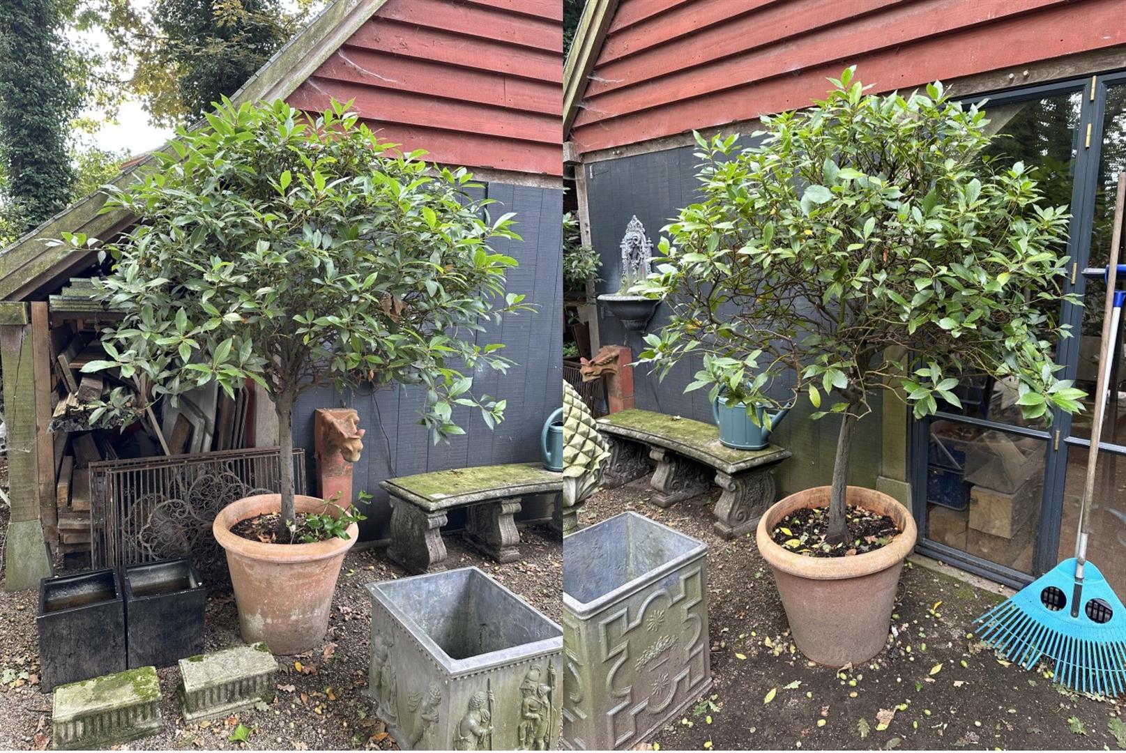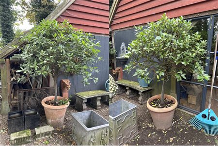 A lot consisting of a set of ficus plants on trunk (suitable for outside). Both in hard-baked Italian terracotta containers. Height approx. 220 cm.