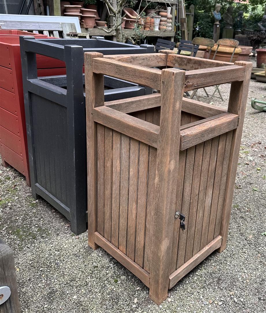 A lot of two different teak planters with lock, one is painted grey. A floor can be placed in it, so that a base cabinet is created. 95 x 50 x 50 cm.