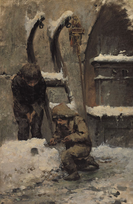 olio su cartone cm. 70x45, opera non firmata, timbro della Galleria d'Arte Carlo Alberto (TO) al retro, pubblicato su "Il Valore dei Dipinti dell'Ottocento e del Primo Novecento", XXX edizione (2012-2013), a cura di Giuseppe Luigi Marini, Umberto Allemandi & C. (TO), pagina 587, opera preparatoria per l'omonimo grande dipinto "Dopo la nevicata".
