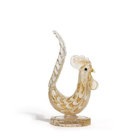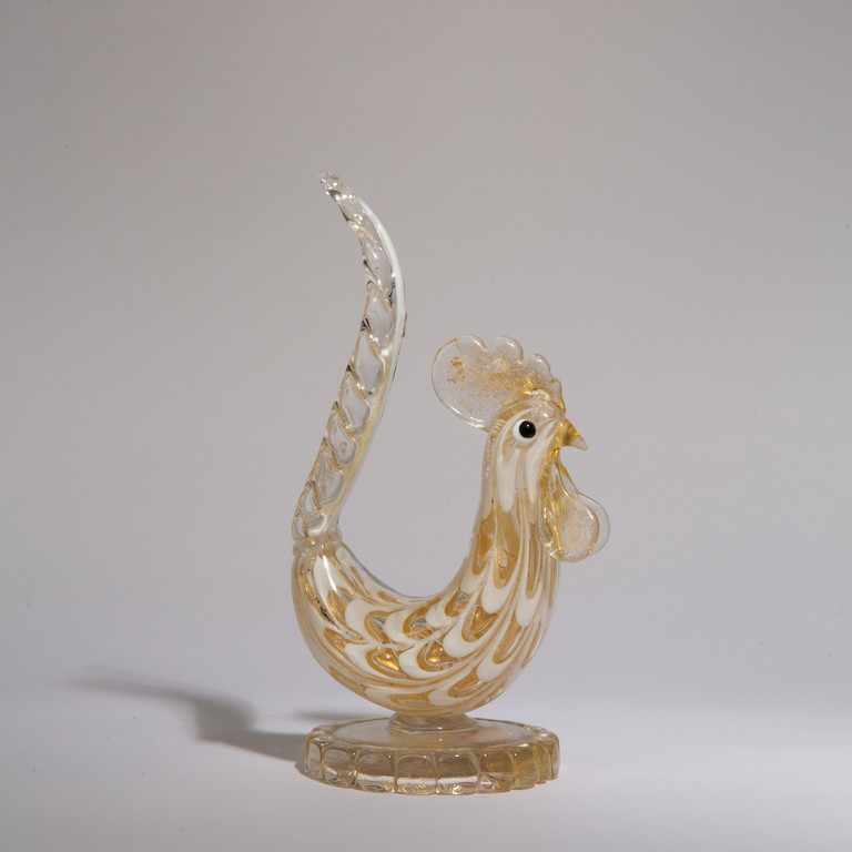 Una figura di gallo in cristallo e foglia oro con decoro fenicio lattimo.