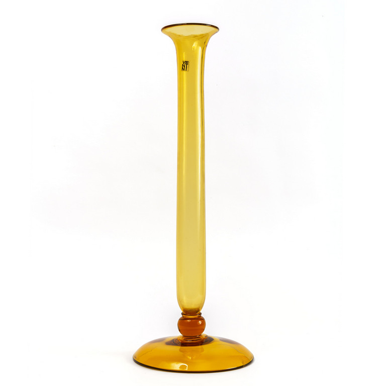 Un vaso a lungo stelo in vetro trasparente ambra.