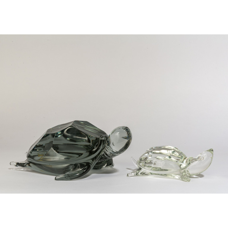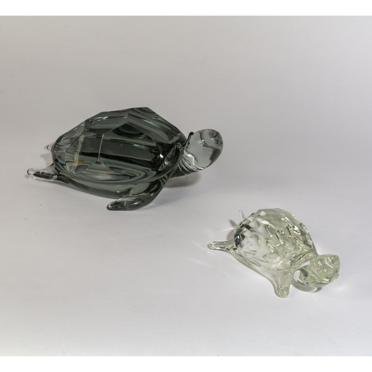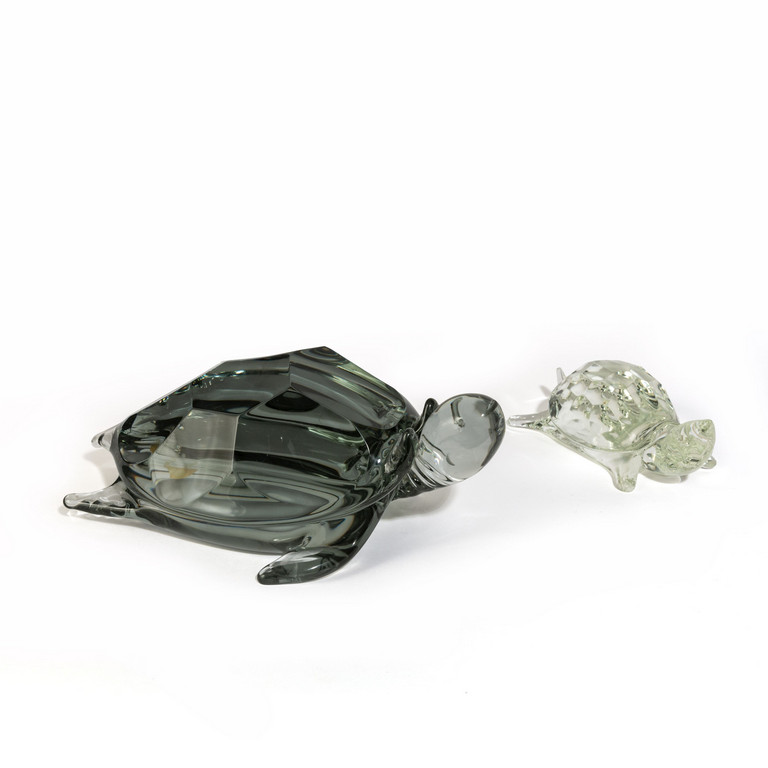 Due tartarughe in cristallo con dorso molato. La grande con etichetta originale.