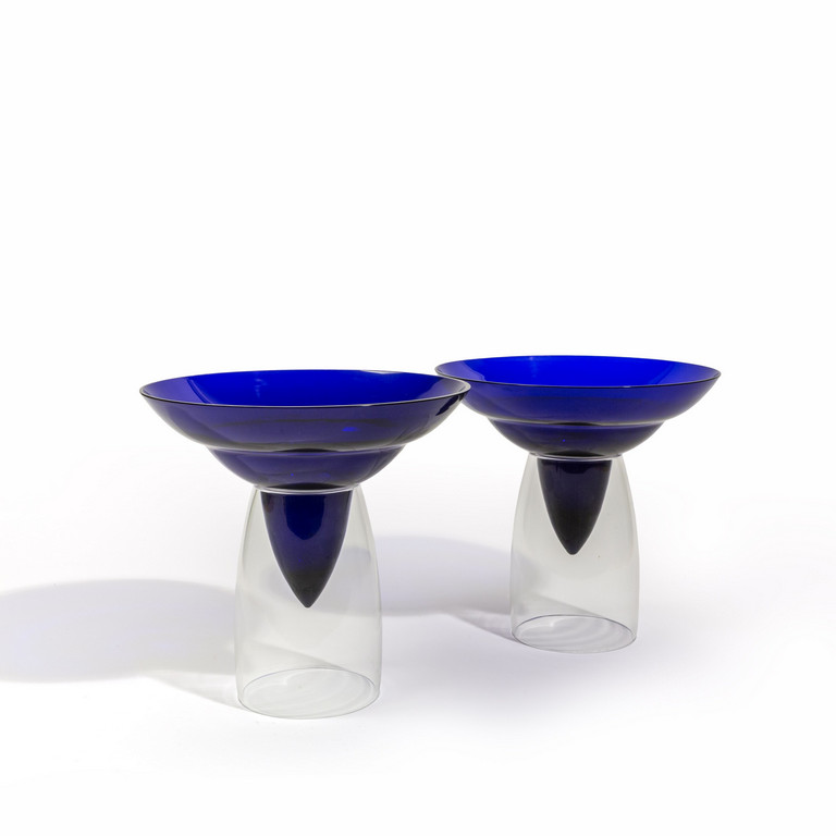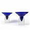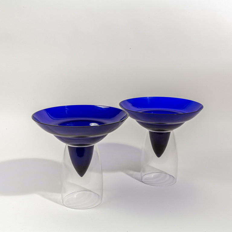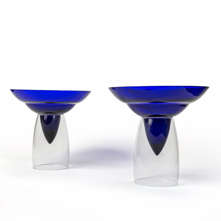 Una coppia di alzate con portafrutta 'effetto blu' base cristallo e portafrutta blu zaffiro.