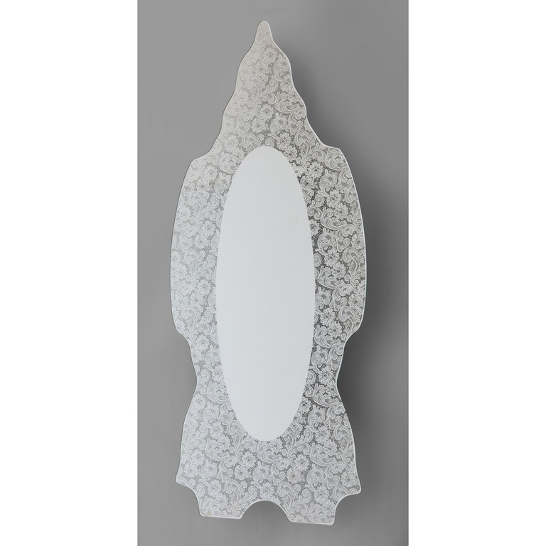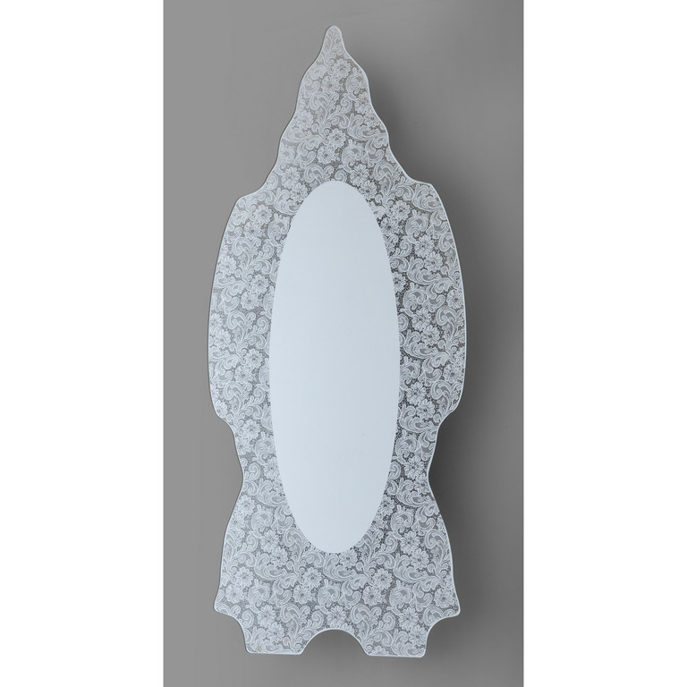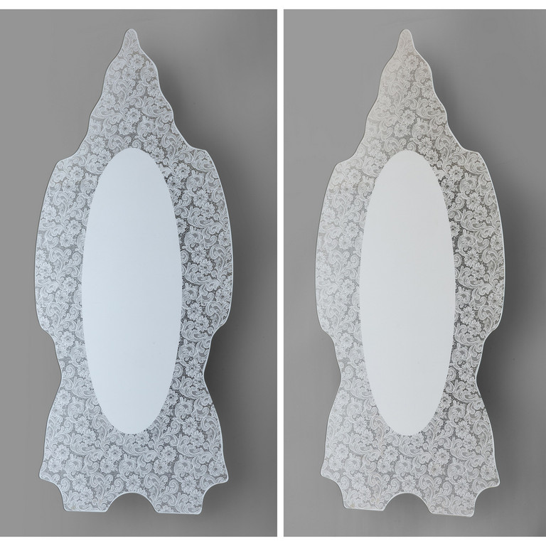 Cristallo sagomato parzialmente argentato con decoro di pizzo specchiante.