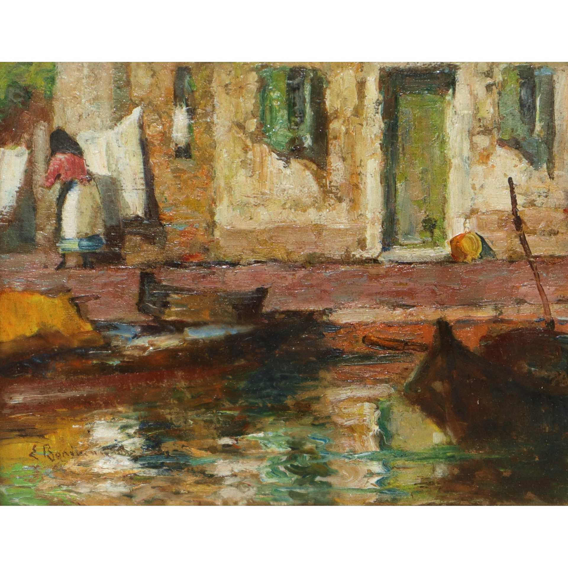 Eugenio Bonivento (Chioggia 1880-Milano 1956) - Donna che stende i panni nel canale con barche, 20° secolo