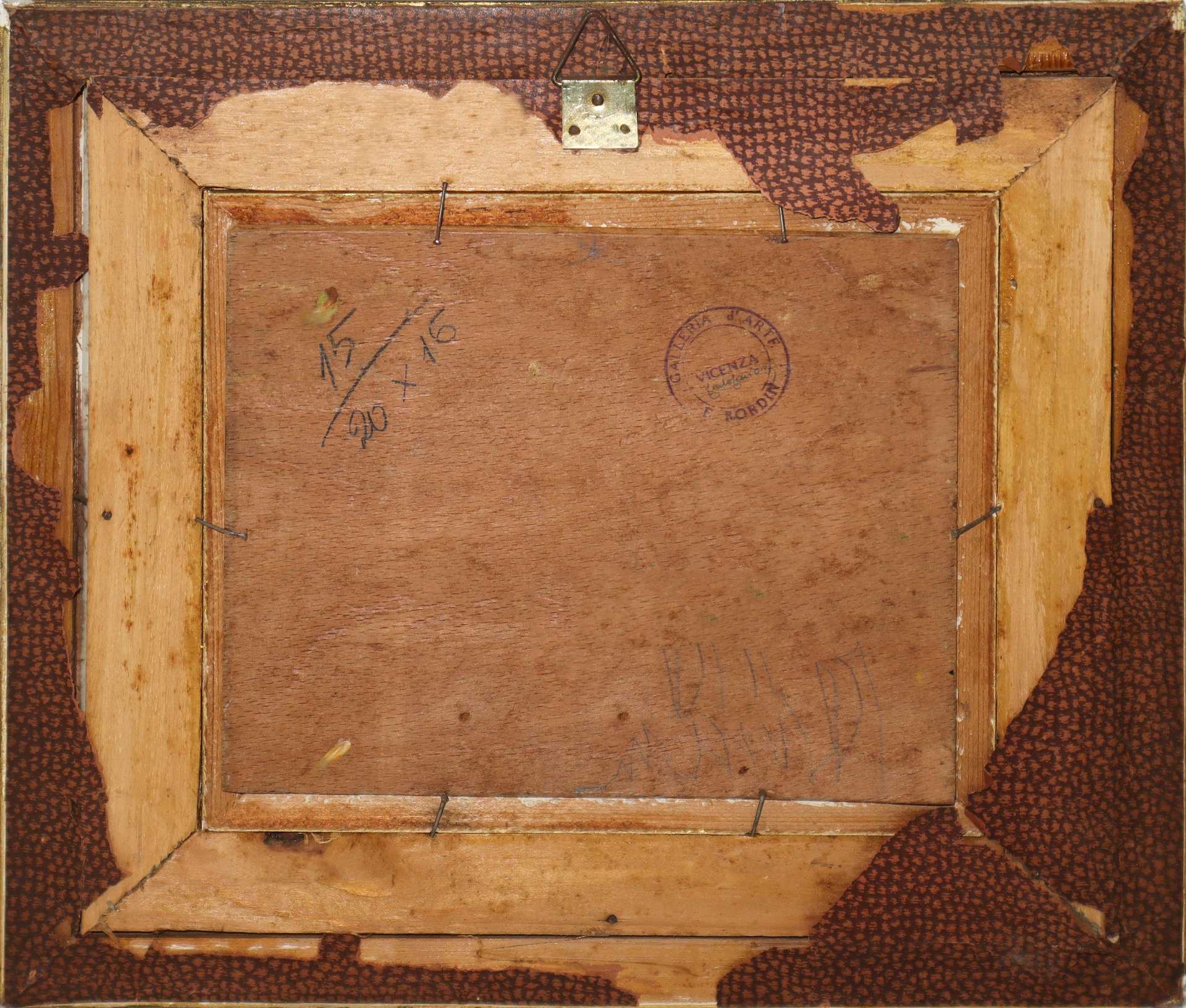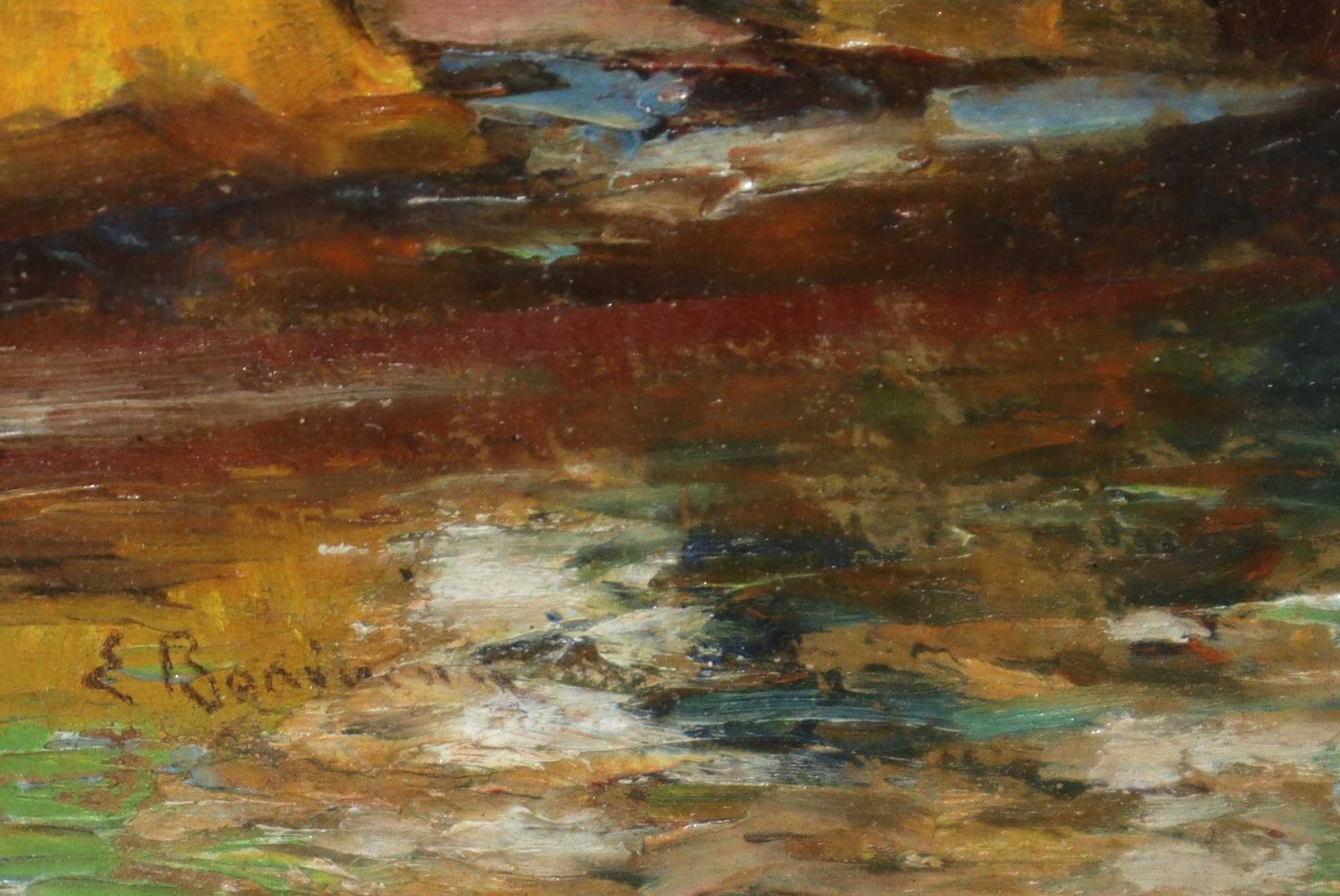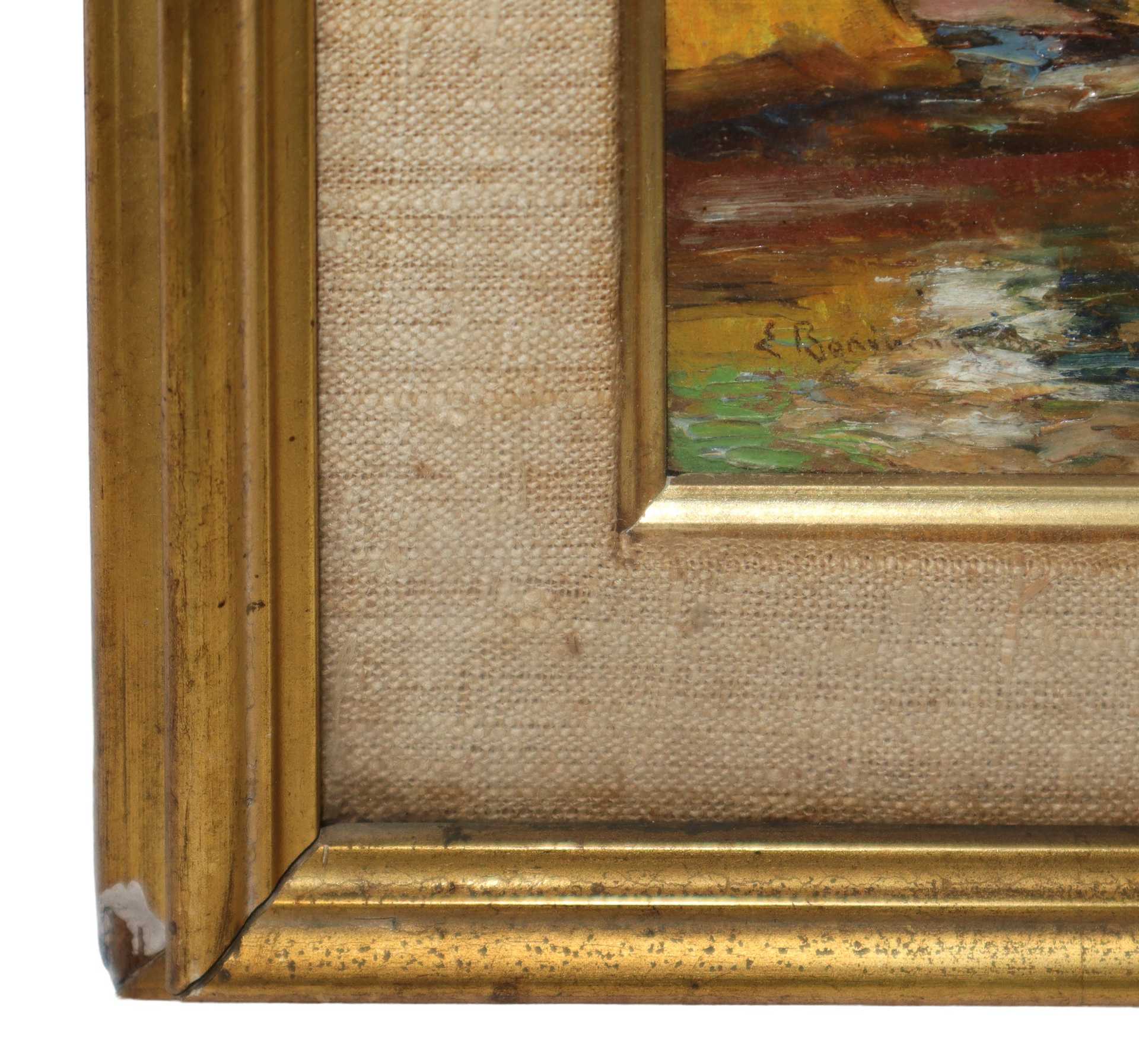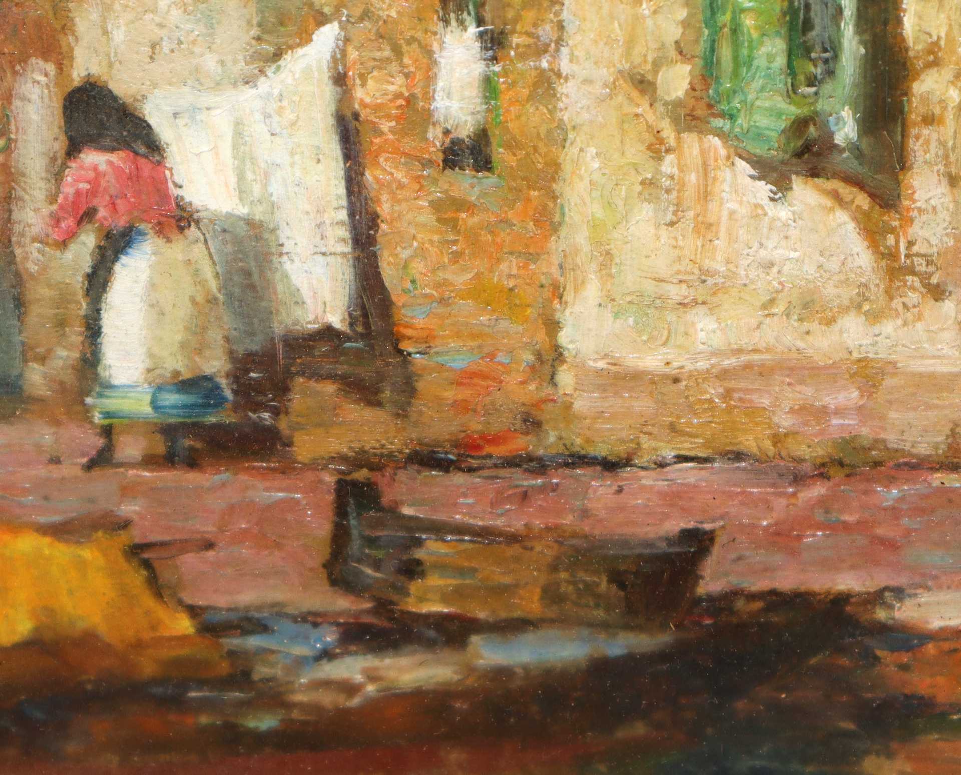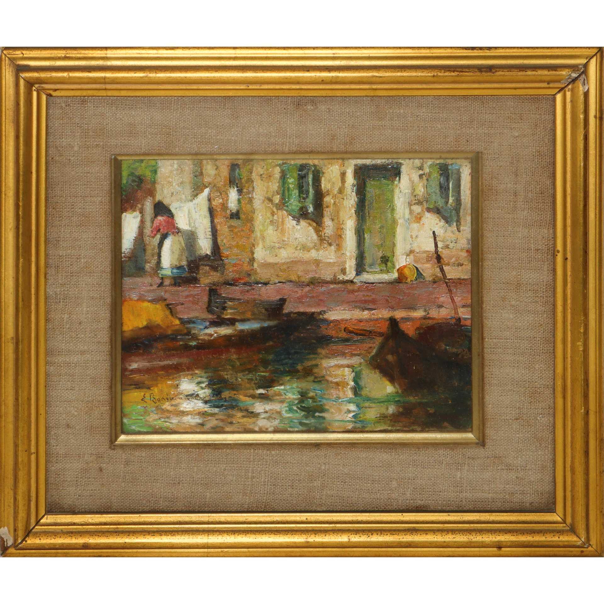 Eugenio Bonivento (Chioggia 1880-Milano 1956) - Donna che stende i panni nel canale con barche, 20° secolo H cm 16x20 - in cornice H cm 29x33 Olio su tavola Firmato in basso a sinistra