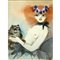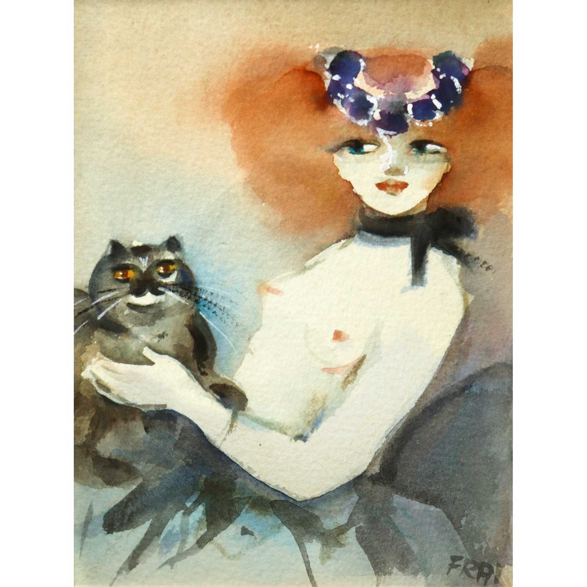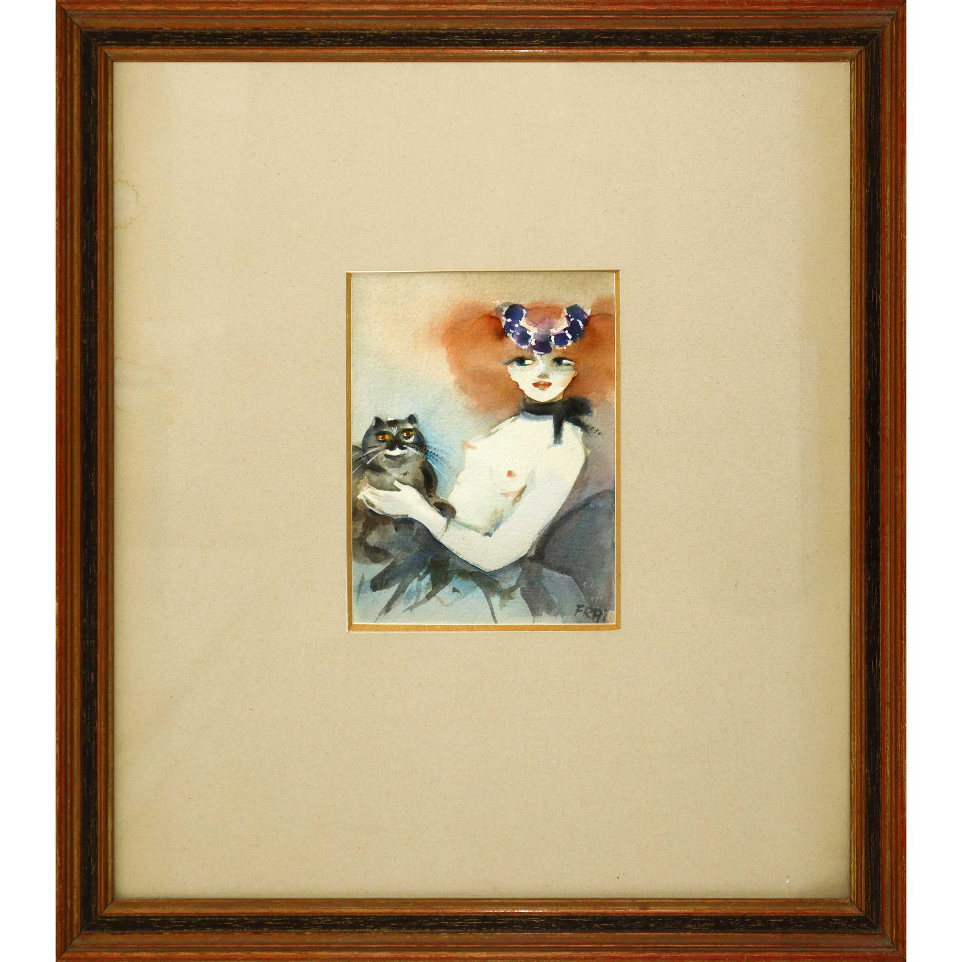 Felicita Frai - Giovane donna con gatto in cornice H cm 45x43 Guache su cartoncino Firmato in basso a destra. al retro certificato di garanzia Galleria La Vite Catania