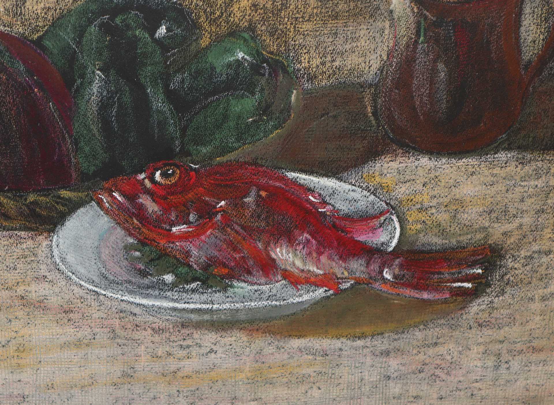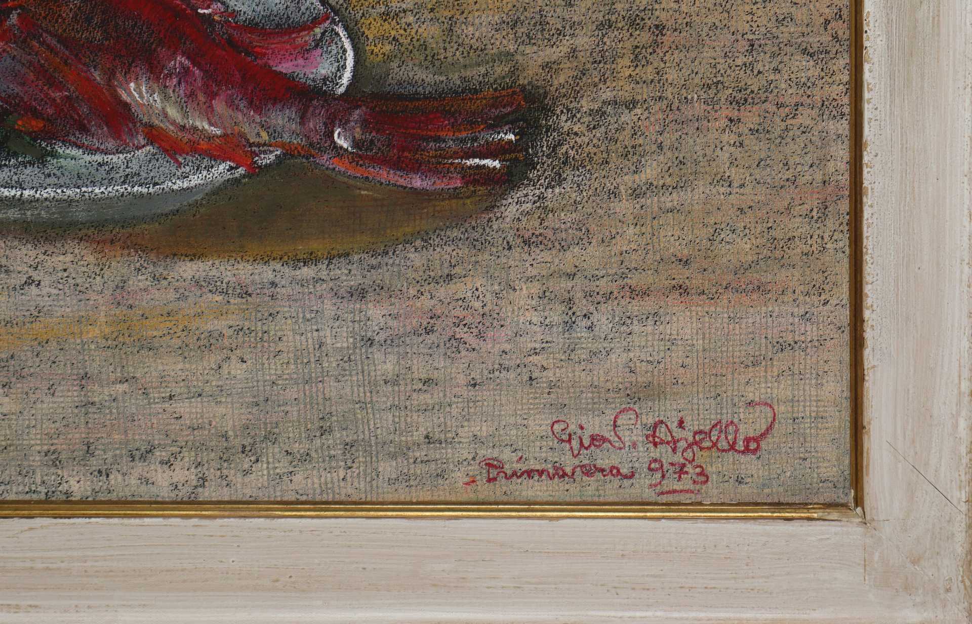 Giovanni Aiello (Susa 1937-Pontedera 2022) - Natura morta con pesci cm 70x49 in cornice cm 84x62 Pastello su cartoncino reintelato Firmato in basso a destra