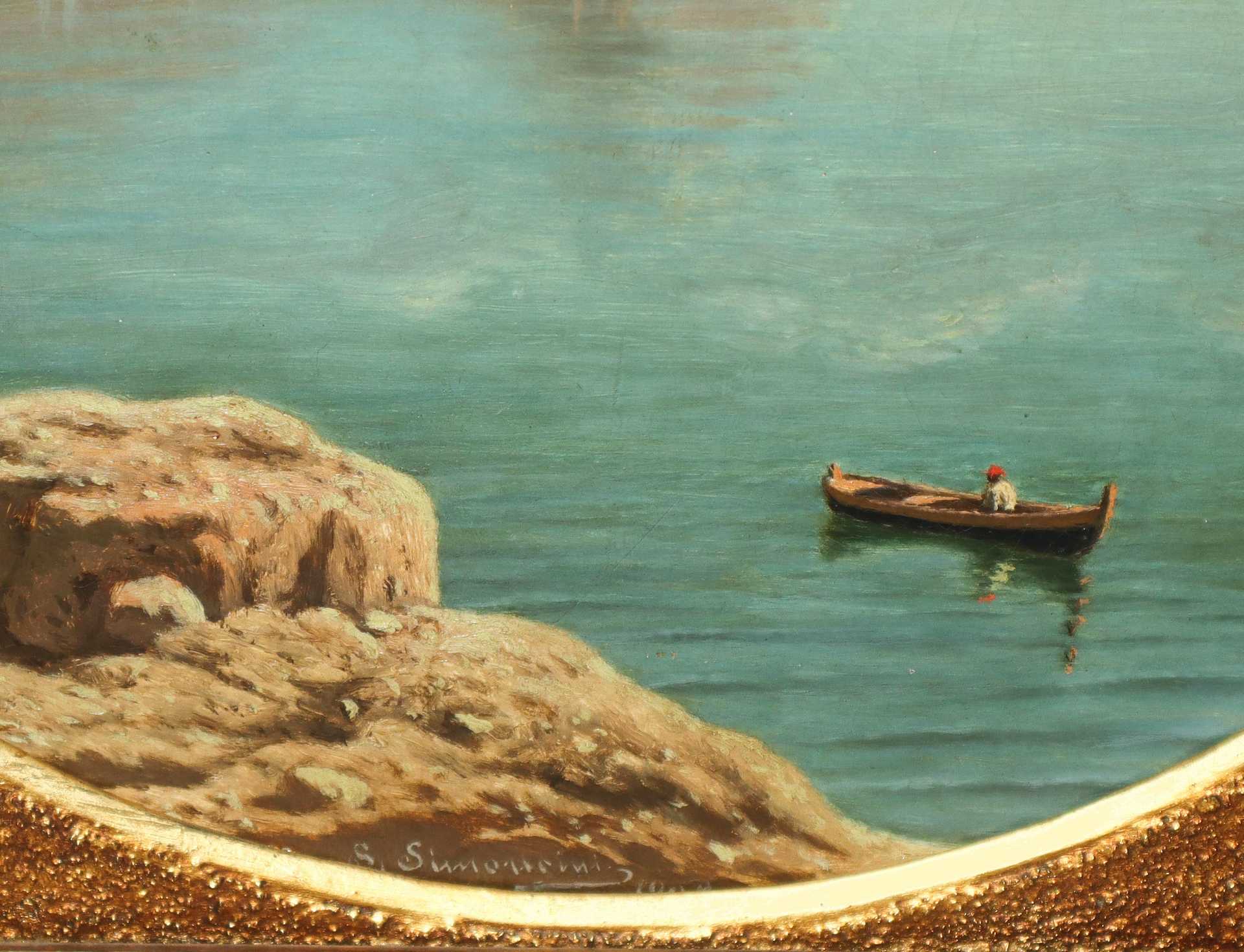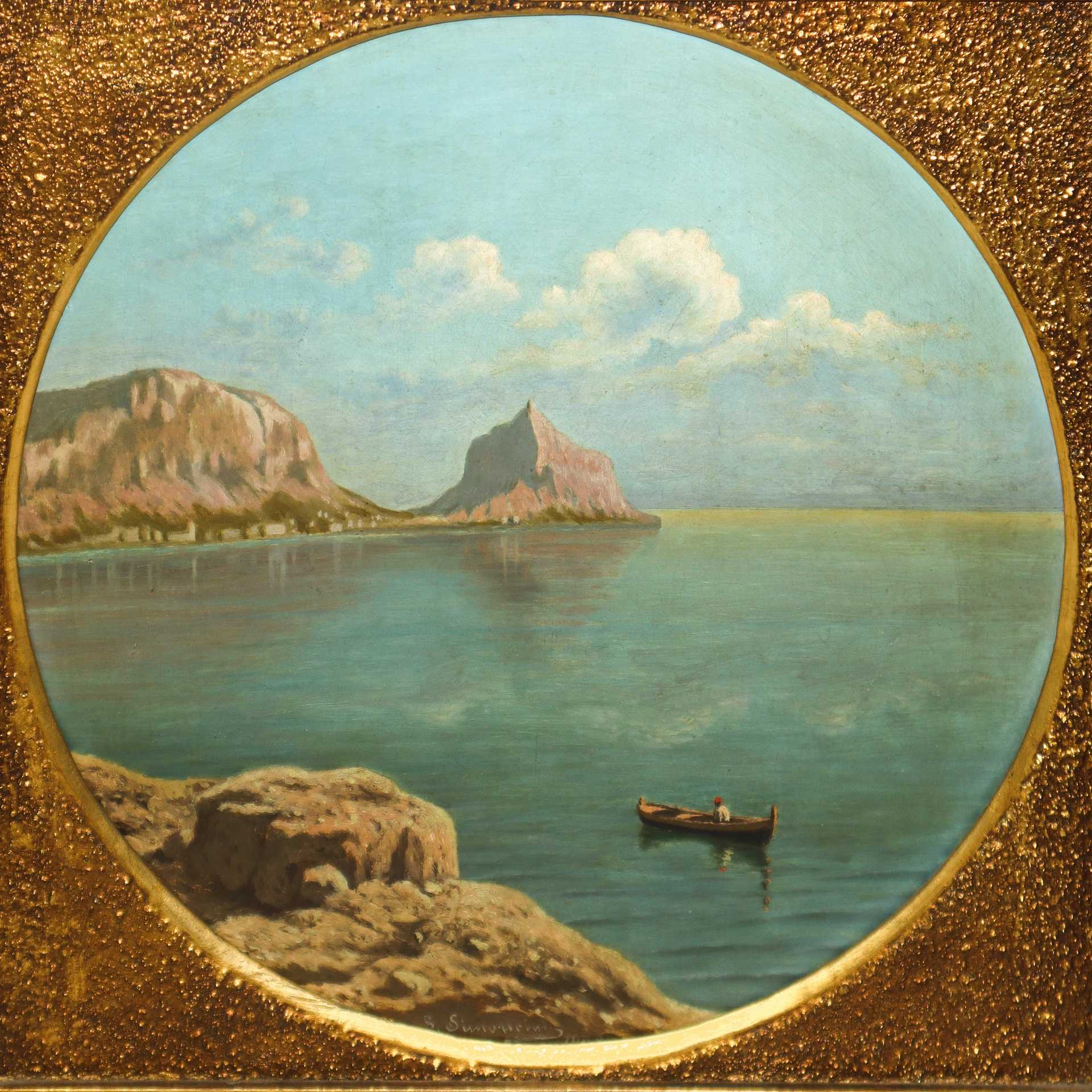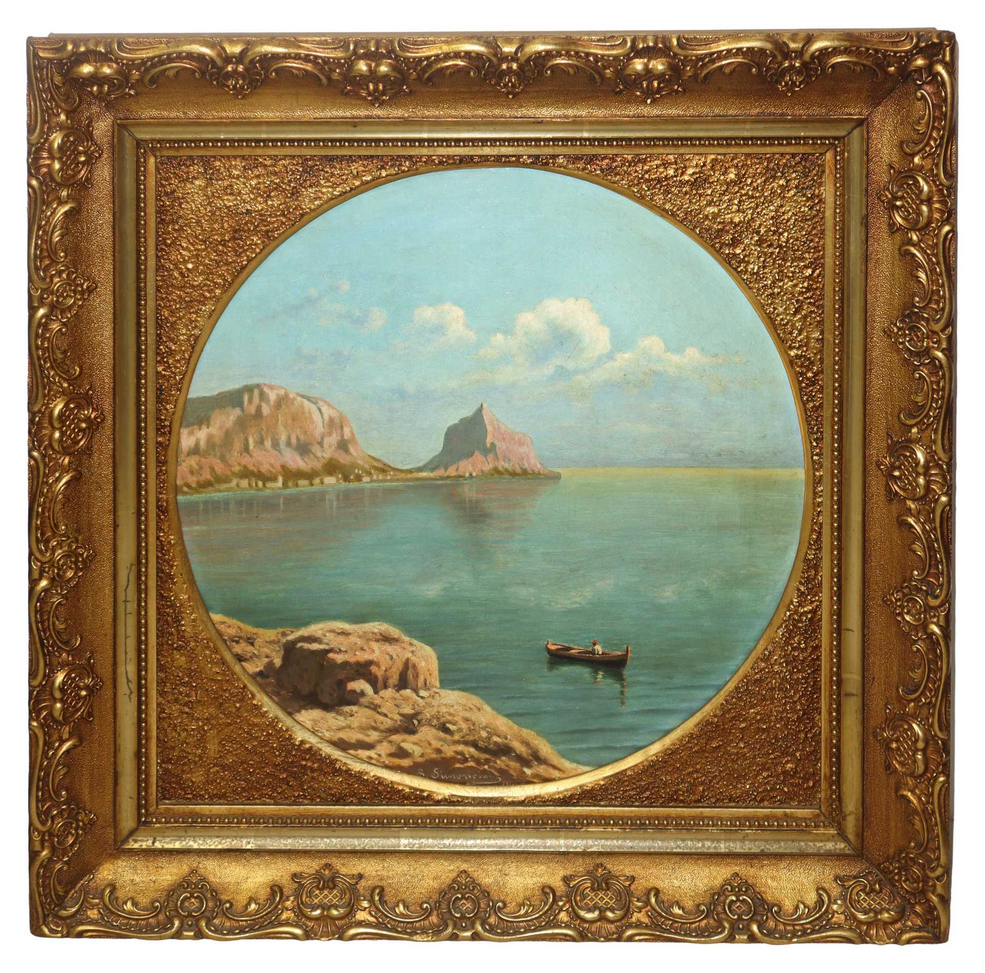 Simoncini Salvatore (Palermo seconda metà dell'800-prima metà del '900) - Paesaggio costiero con scogli e barca D cm 36, incornice cm 51 x 51 Simoncini. Entro cornice dorataSimoncini. Entro cornice dorata