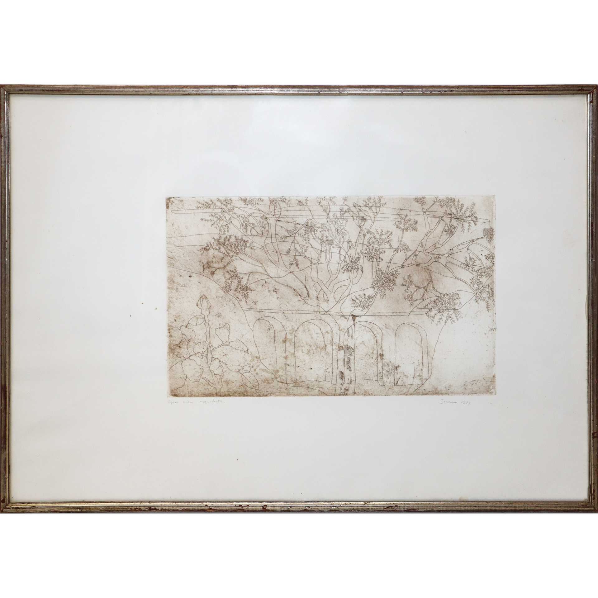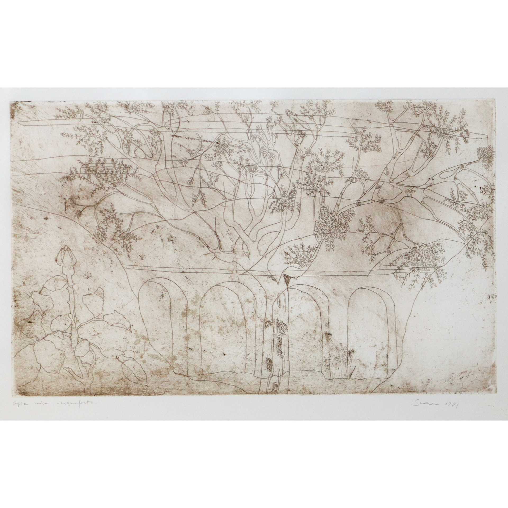 Giuseppe Sorano (Siracusa 1896-Siracusa 1968) - Paesaggio con ruderi, 1981 H cm 24x39,5 - in cornice H cm 51x71,5 Acquaforte Firmata e datata in basso a destra. Copia unica.