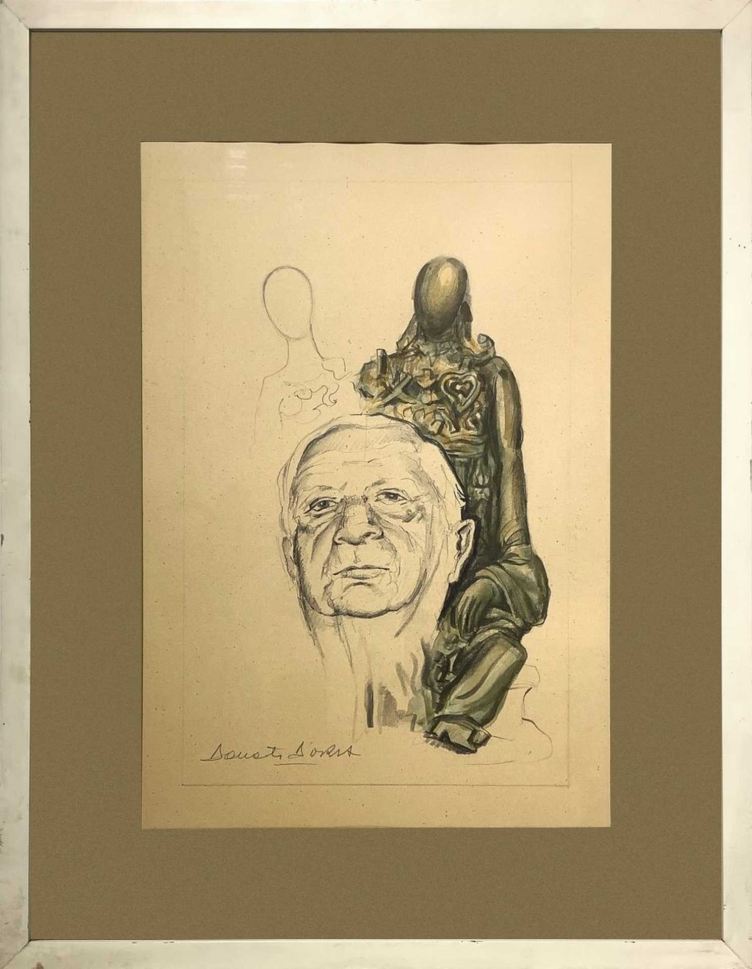 Toni Donati Doria (1929) - Volto di uomo con manichini cm 47 x cm 33; in cornice cm 67 x cm 52 Disegno ad acquerello su carta seppiata Firmato in basso a sinistra.