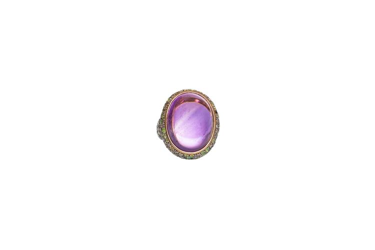 Anello in oro rosa con ametista centrale e carrè di diamanti taglio brillante