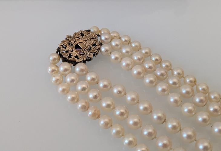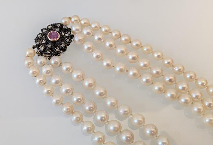 Collana di perle a tre fili, chiusura in oro brunito con rubino