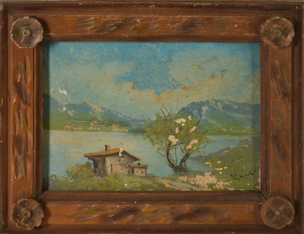 Ignoto PAESAGGIO LACUSTRE olio su masonite, cm 18x24 firma L'opera presenta...