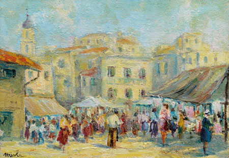 MIOLA MILLY Fiera in paese (Bordighera)olio su tela applicata su tavola cm....