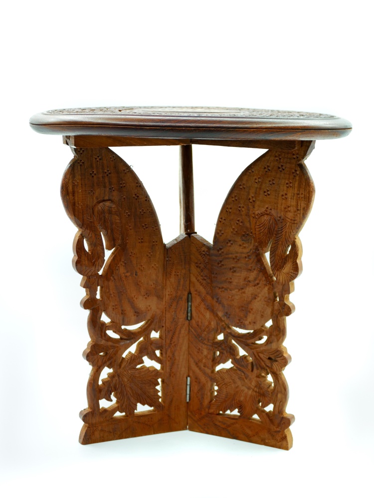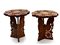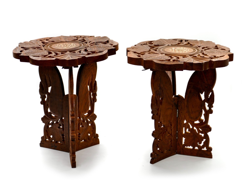 Due tavolini scolpiti Metà del XX secolo Legno naturale intagliato e traforato, decorazione in osso intarsiata a medaglione 33 x 30 x 30 cm