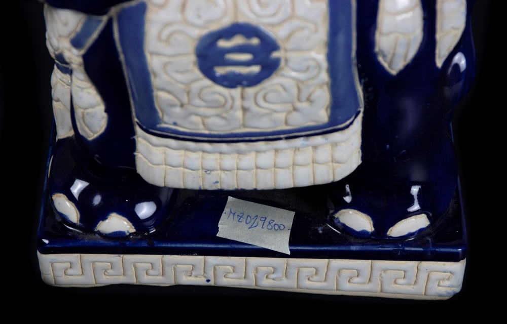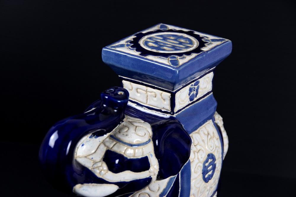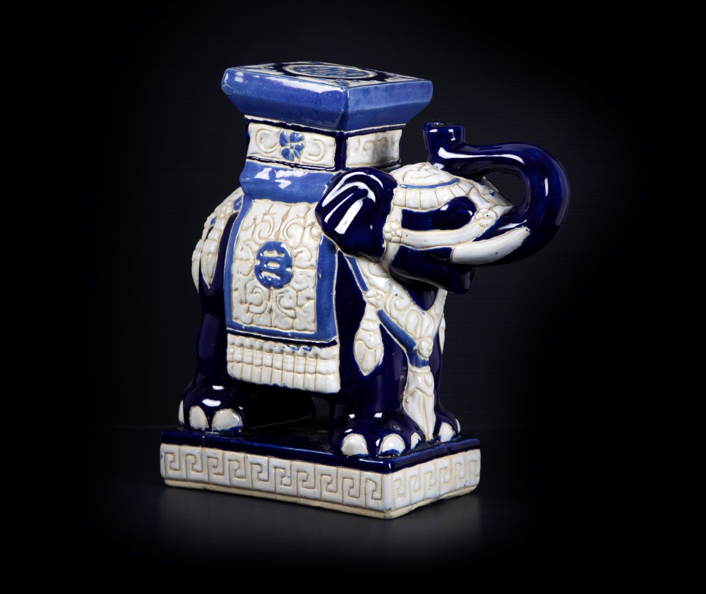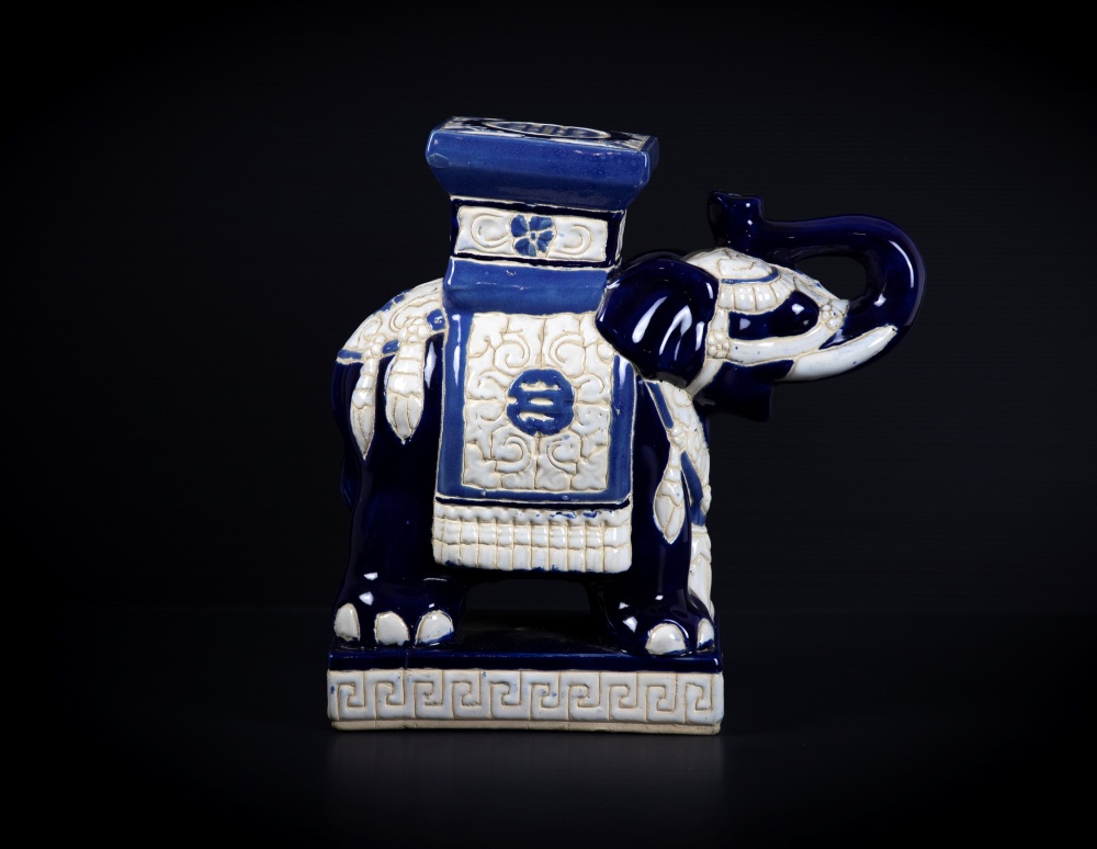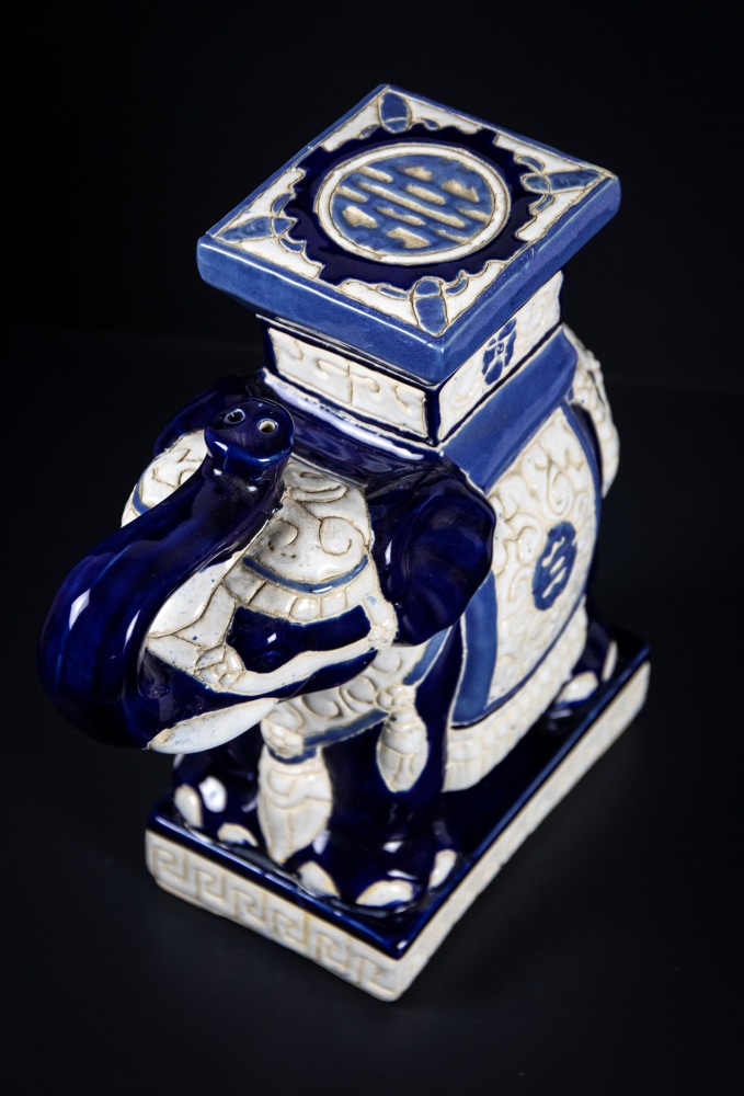 Ceramica colorata 32 x 29 x 14 cm Elefante blu della fortuna Scultura vintage in ceramica Buone condizioni generali, tranne qualche mancanza di colore sulla superficie della ceramica