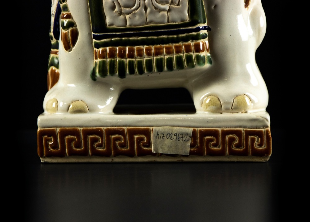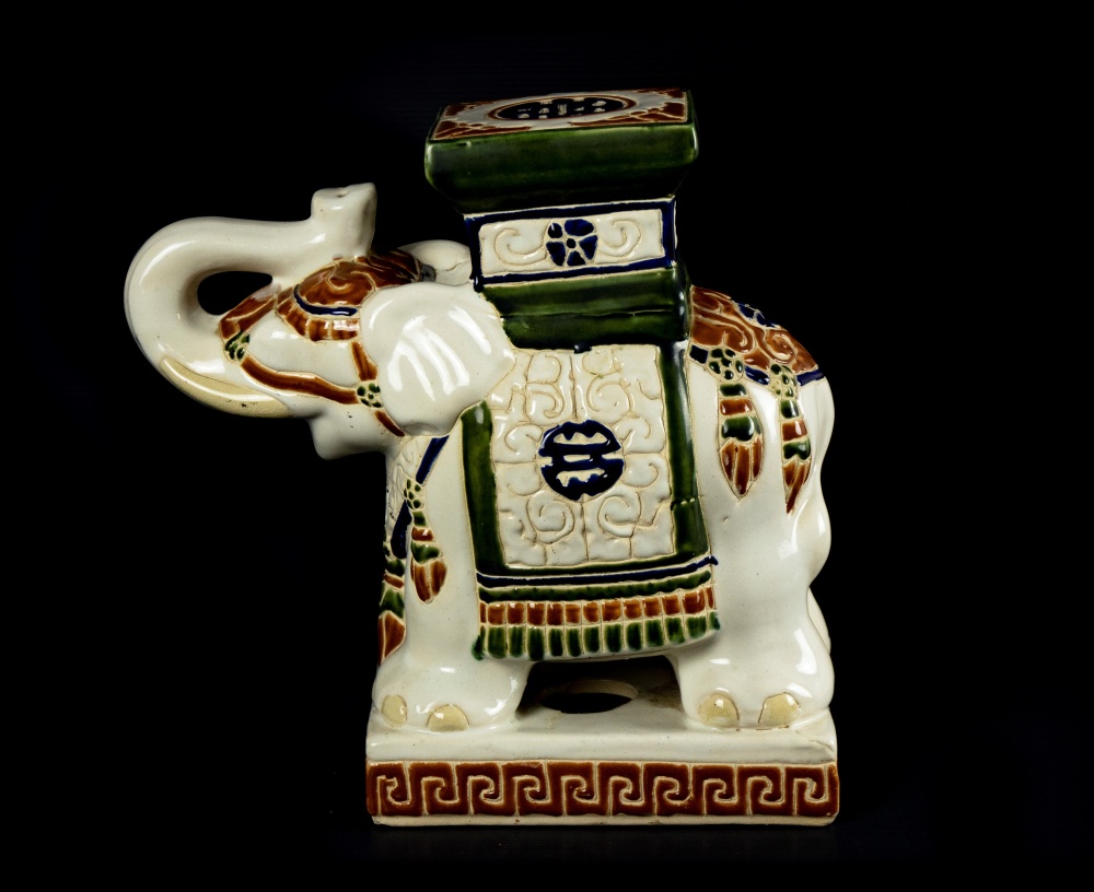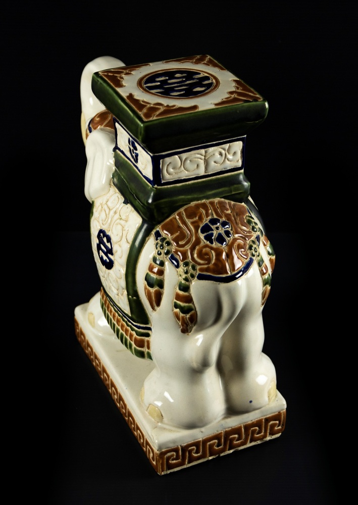 Ceramica colorata 32 x 31,5 x 13,5 cm Elefante della fortuna Scultura vintage in ceramica Buone condizioni generali, tranne qualche mancanza di colore sulla superficie della ceramica