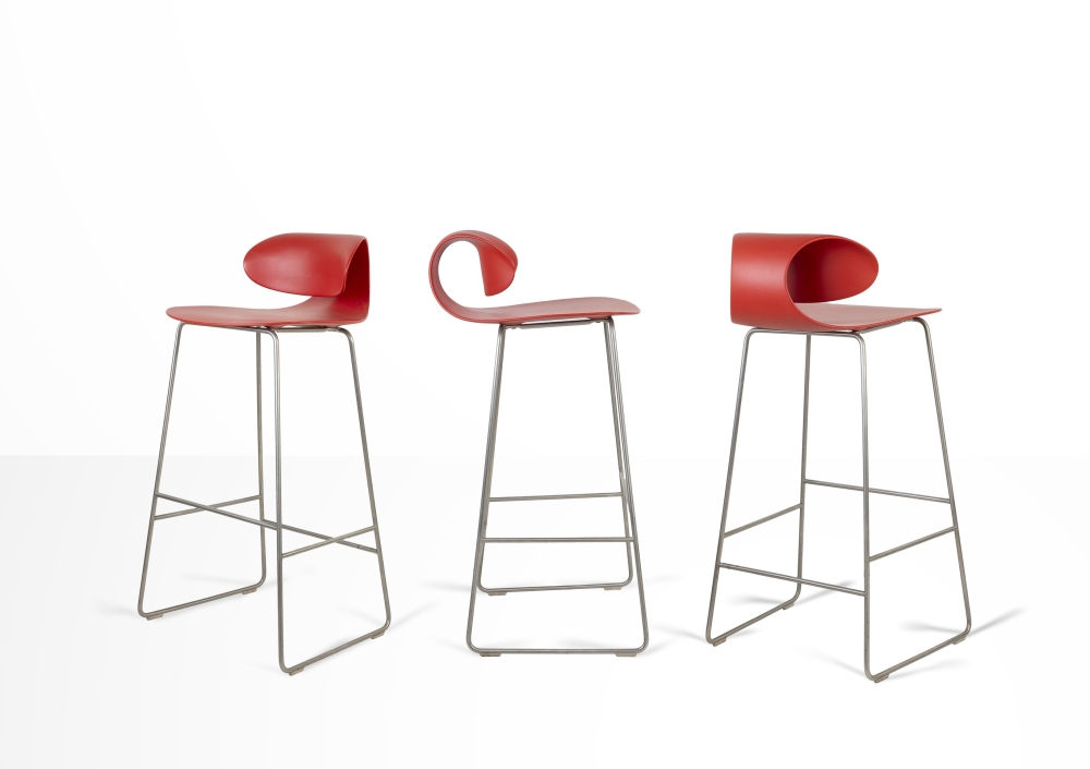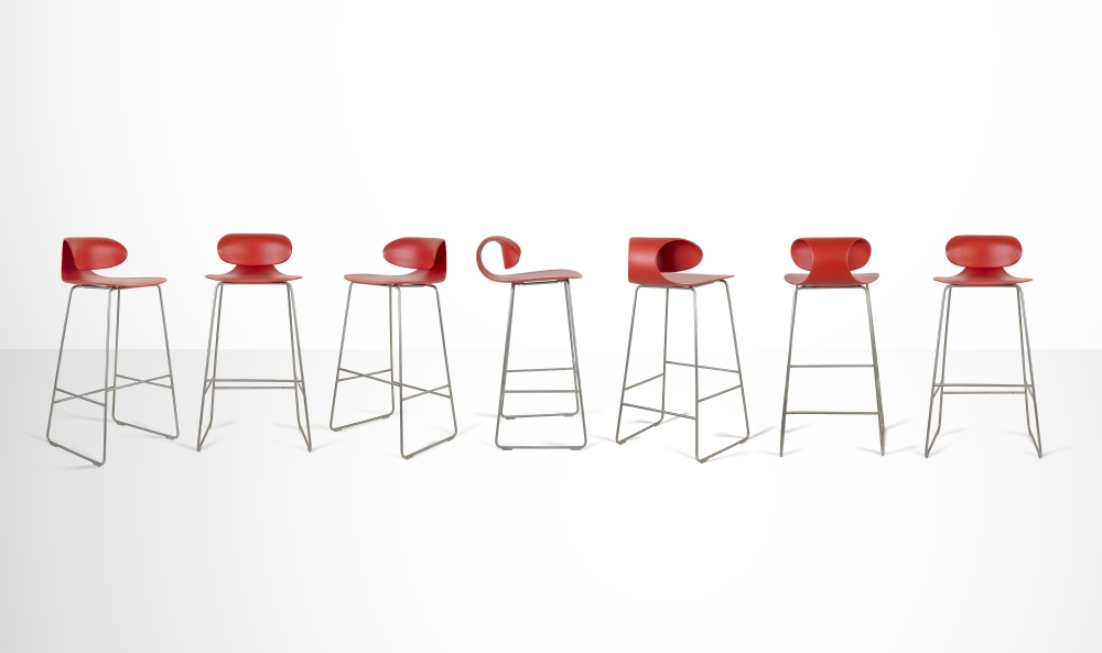 Set di 7 panche Maxima rosse 1990s Policarbonato stampato con struttura e poggiapiedi in acciaio 99 x 50,8 x 53,5 cm