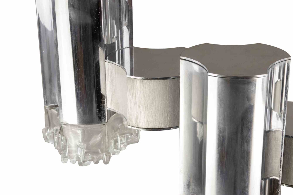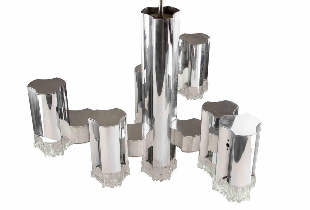 Dimensions body: 54x68x68 cm. Lampadario “modernista” attribuito a Gaetano Sciolari e realizzato negli anni Settanta.