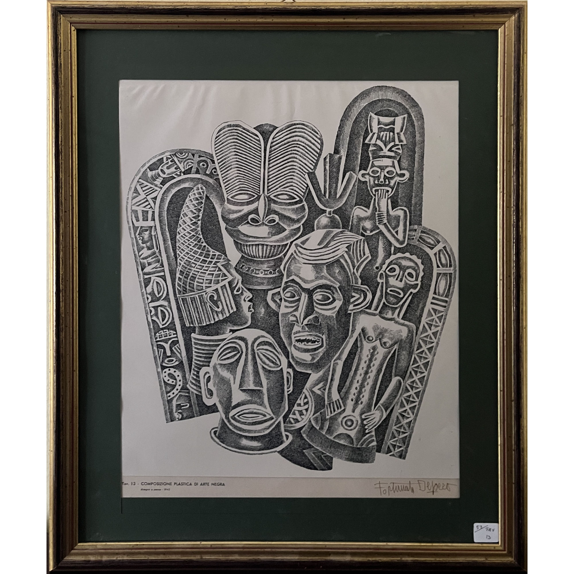 Fortunato Depero , Composizione plastica di arte negra (1943), stampa litografica con firma autografa su supporto, cm 39,5x29. In cornice. L'opera è tratta dal fascicolo intitolato "Ventidue disegni del pittore poeta Depero", stampato dallo stesso nel 1944 con tiratura totale di 200 esemplari. La presente corrisponde alla tav. 13 ed è tratta dal portfolio nr. 107 / 200