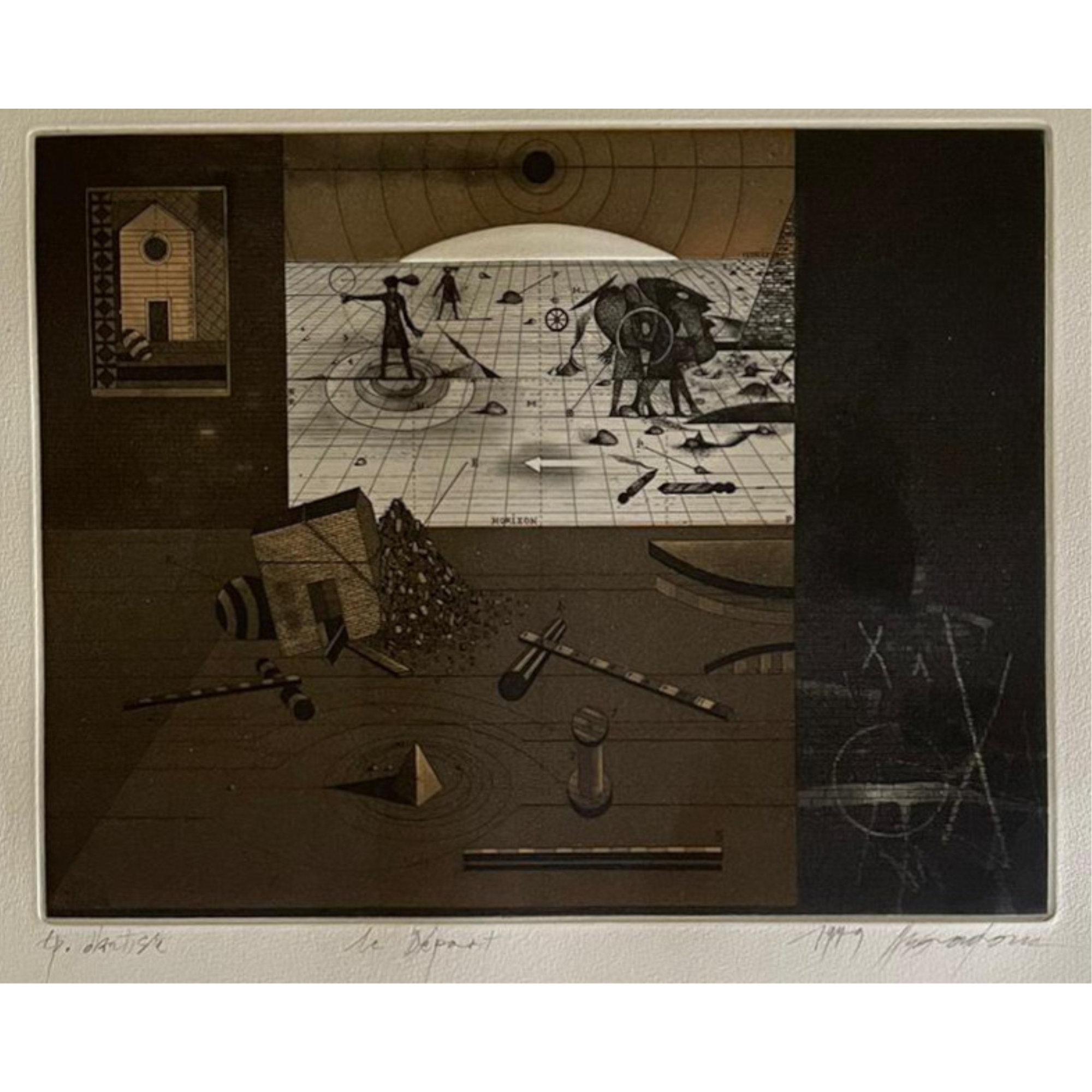 Assadour , Le Depart (1979), acquaforte e acquatinta a colori. Firma autografa