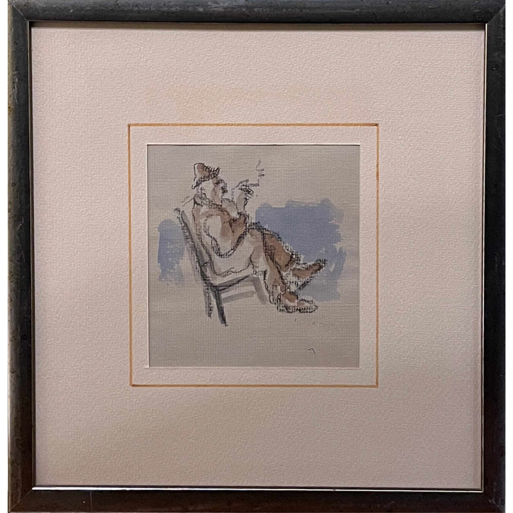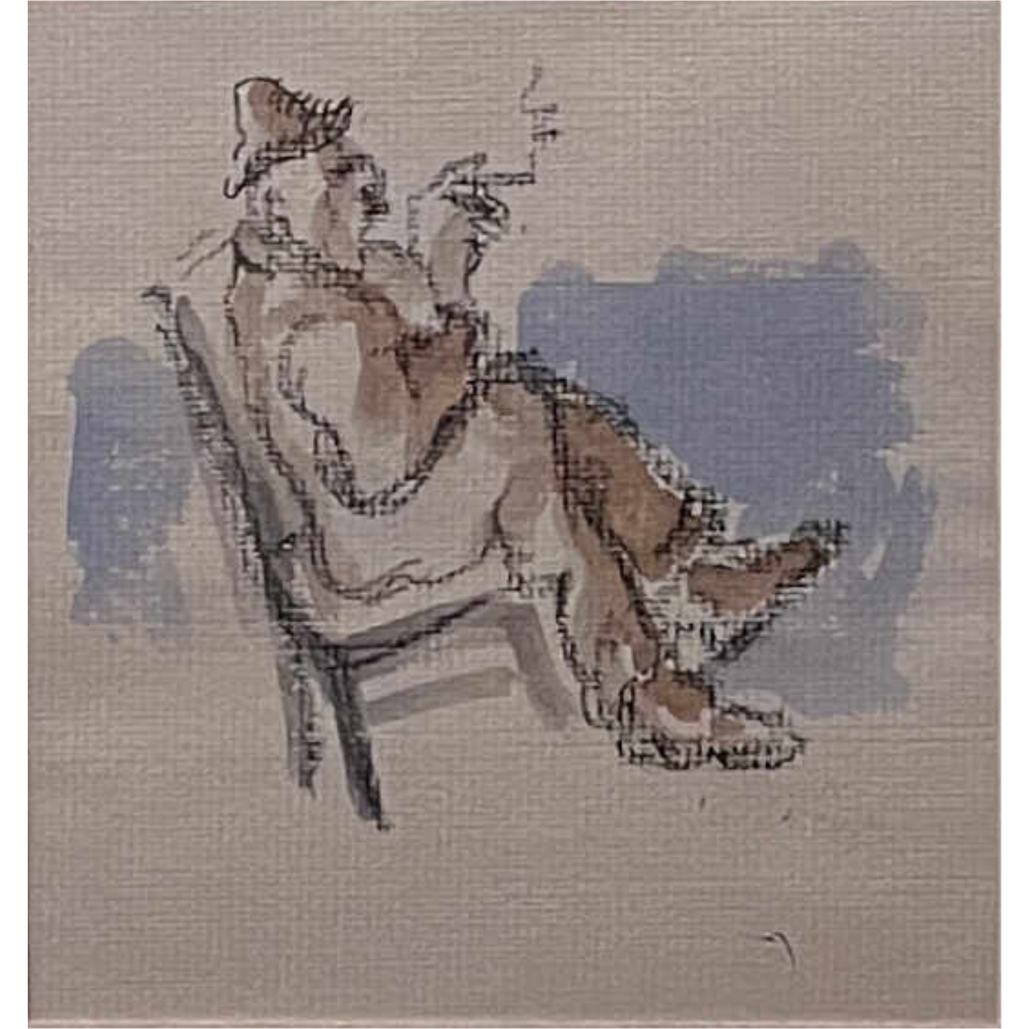 Guido Polo, Siesta del fumatore, 1943, Acquerello su carta di Siena, cm 12x11. In cornice cm 27x27. Etichetta al retro.