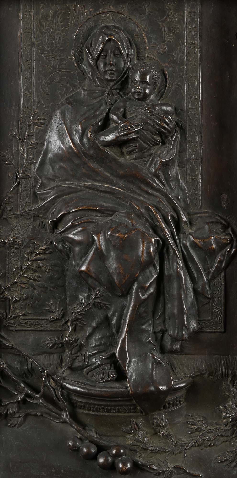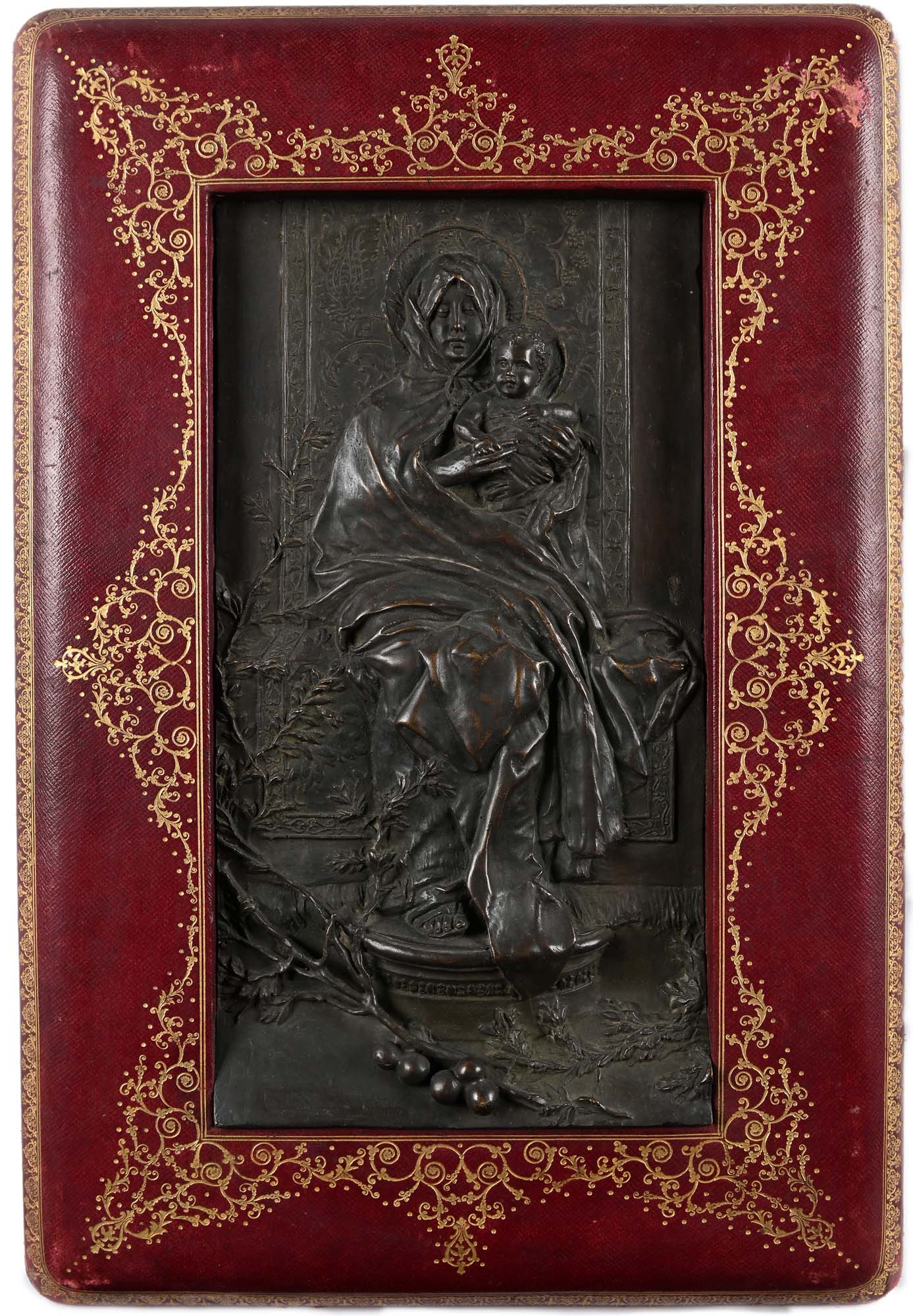 Madonna col Bambino, da Nicolò Barabino bassorilievo in bronzo Quasi Oliva Speciosa In Campis entro cornice in pelle rossa con decorazione impressa in oro cm 35x19 - in cornice cm 51x35