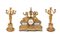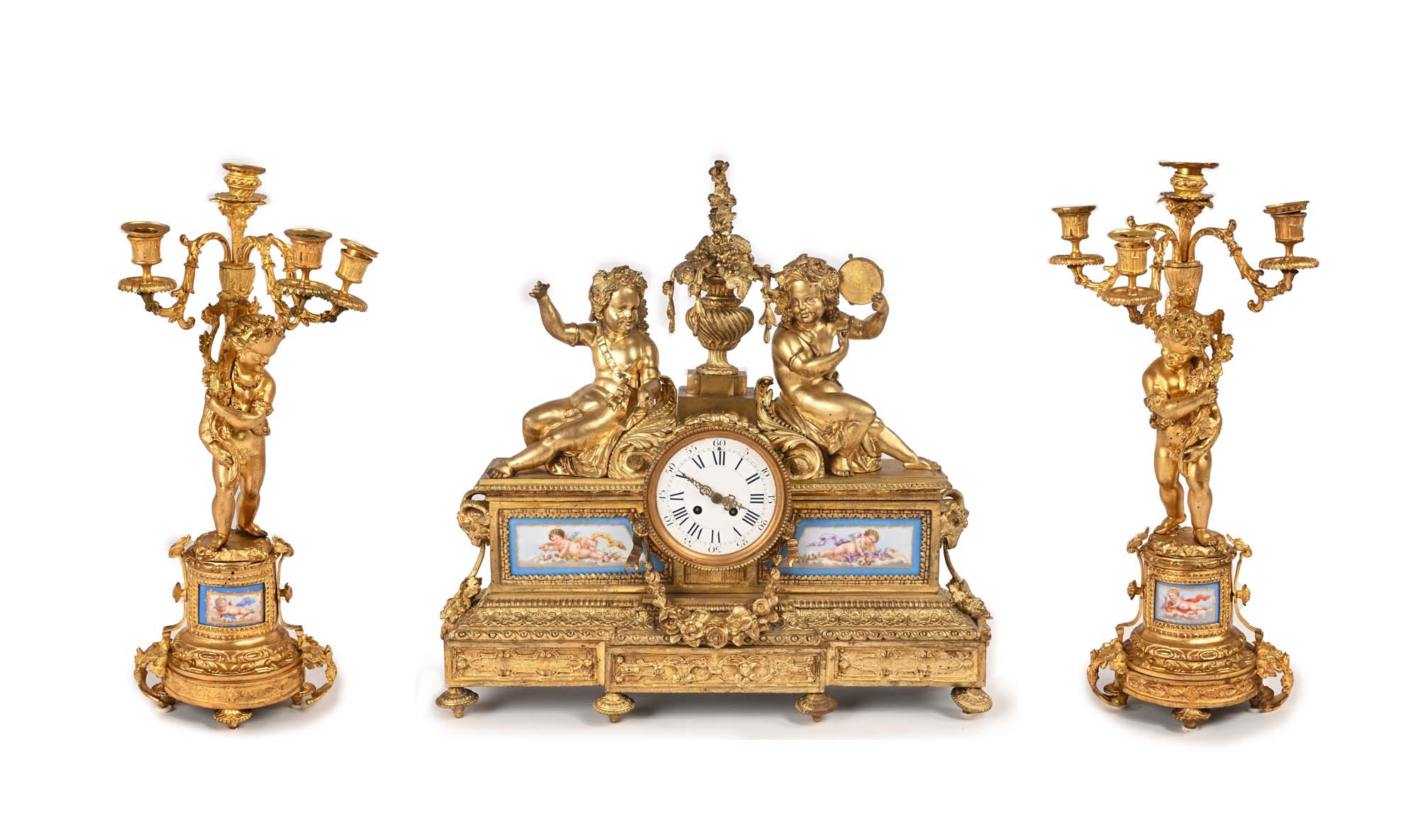 Grande trittico da camino in bronzo dorato con placche in porcellana di Sevrès, Francia, XIX secolo composto da un orologio ed una coppia di candelabri a quattro luci; il primo è caratterizzato da figure di amorino con cimbali e uva fra i capelli posti sulla sommità del basamento decorato da placche in porcellana; al centro quadrante circolare a due fori di carica con indicazione oraria a numeri romani ed arabi per i minuti; i candelabri recano bracci sagomati emergenti da un tralcio di vite sorretto da figura di amorino cm 57x60x18 e altezza cm 56