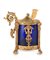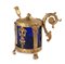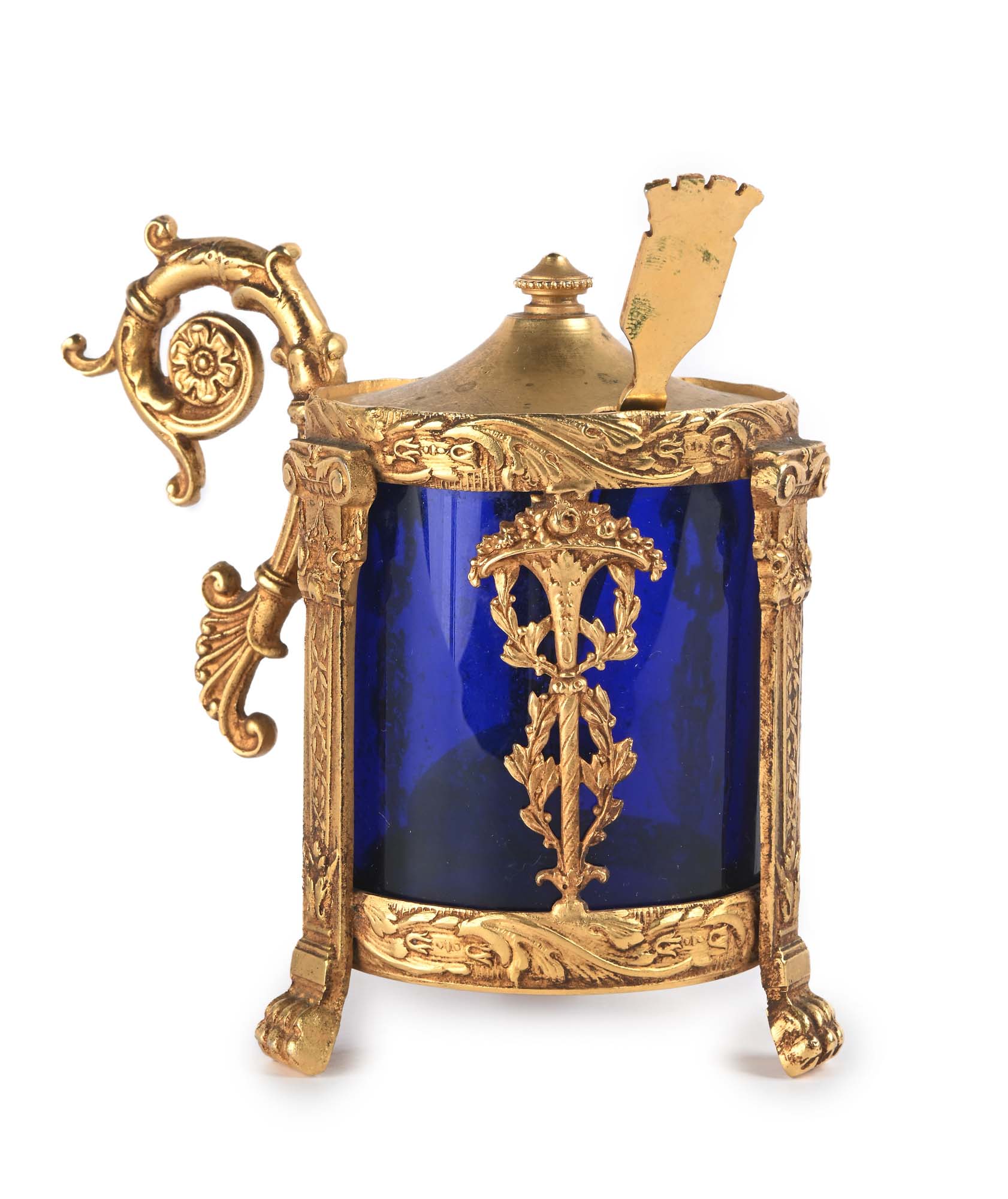 Mustard cup in metallo dorato d'epoca Impero contenitore cilindrico in vetro blu entro struttura costituita da due anelli percorsi da motivi vegetali, riuniti da fregi di gusto Impero arricchiti da rami d'ulivo alternati a tre lesene minuziosamente cesellate terminanti a piede ferino che fungono da sostegno; coperchio a pagoda, manico sagomato con estremità a ricciolo centrato da corolla; completa di cucchiaio con impugnatura dominata da scudo sormontato da corona turrita