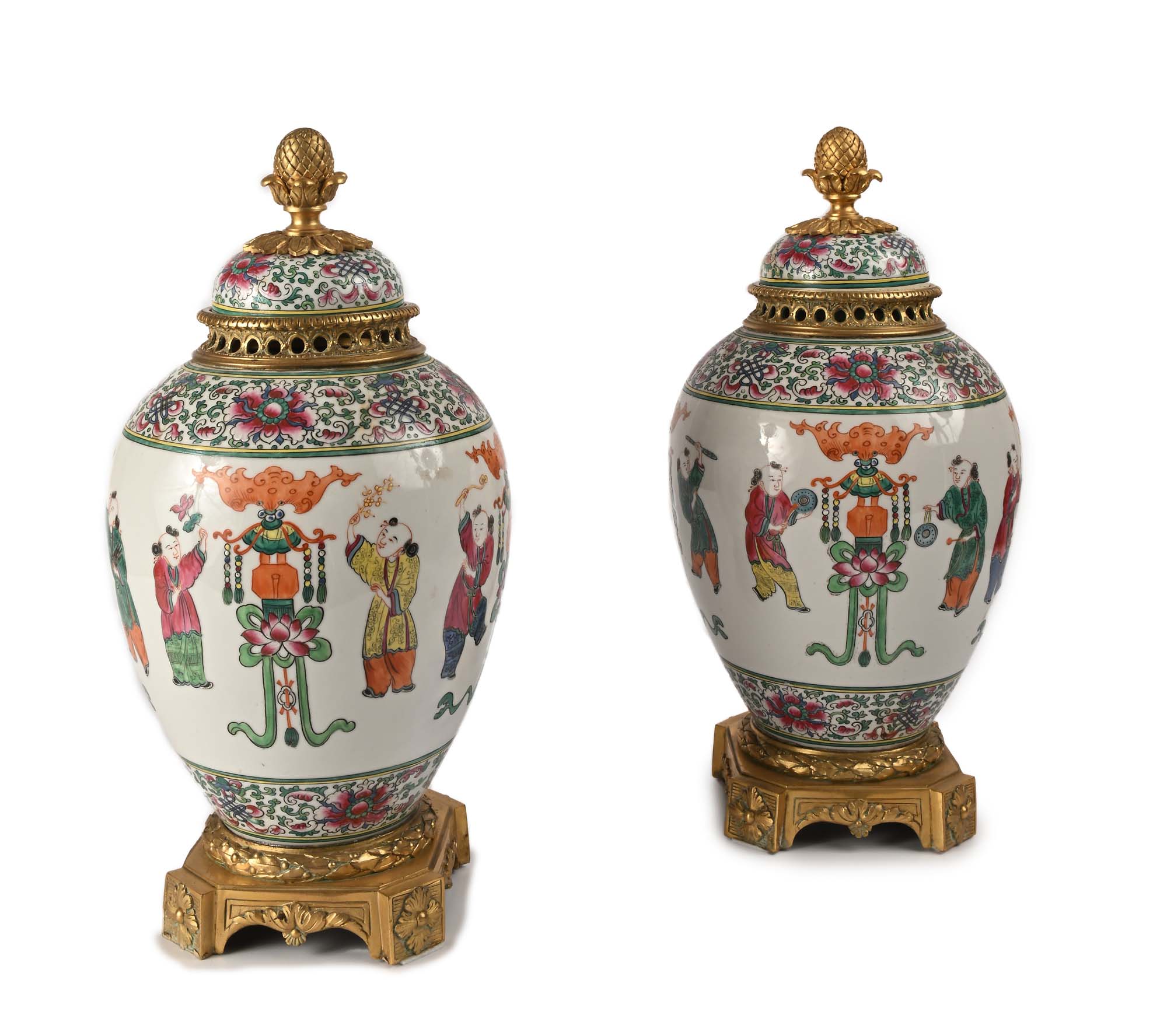 Coppia di potiches in porcellana e bronzo dorato, Canton, XIX secolo altezza cm 42
