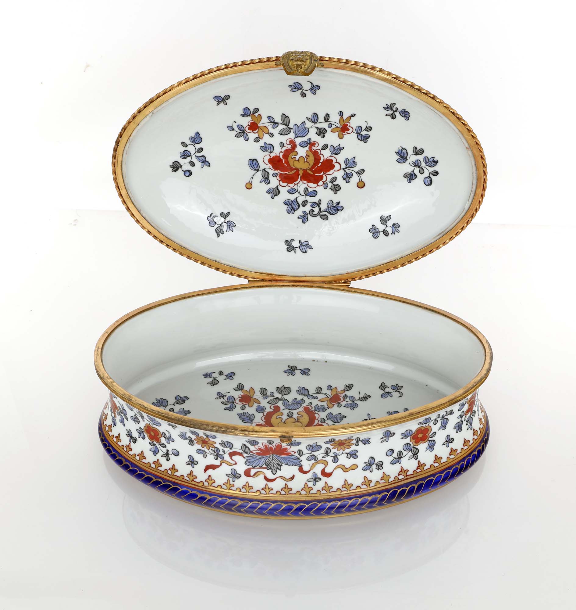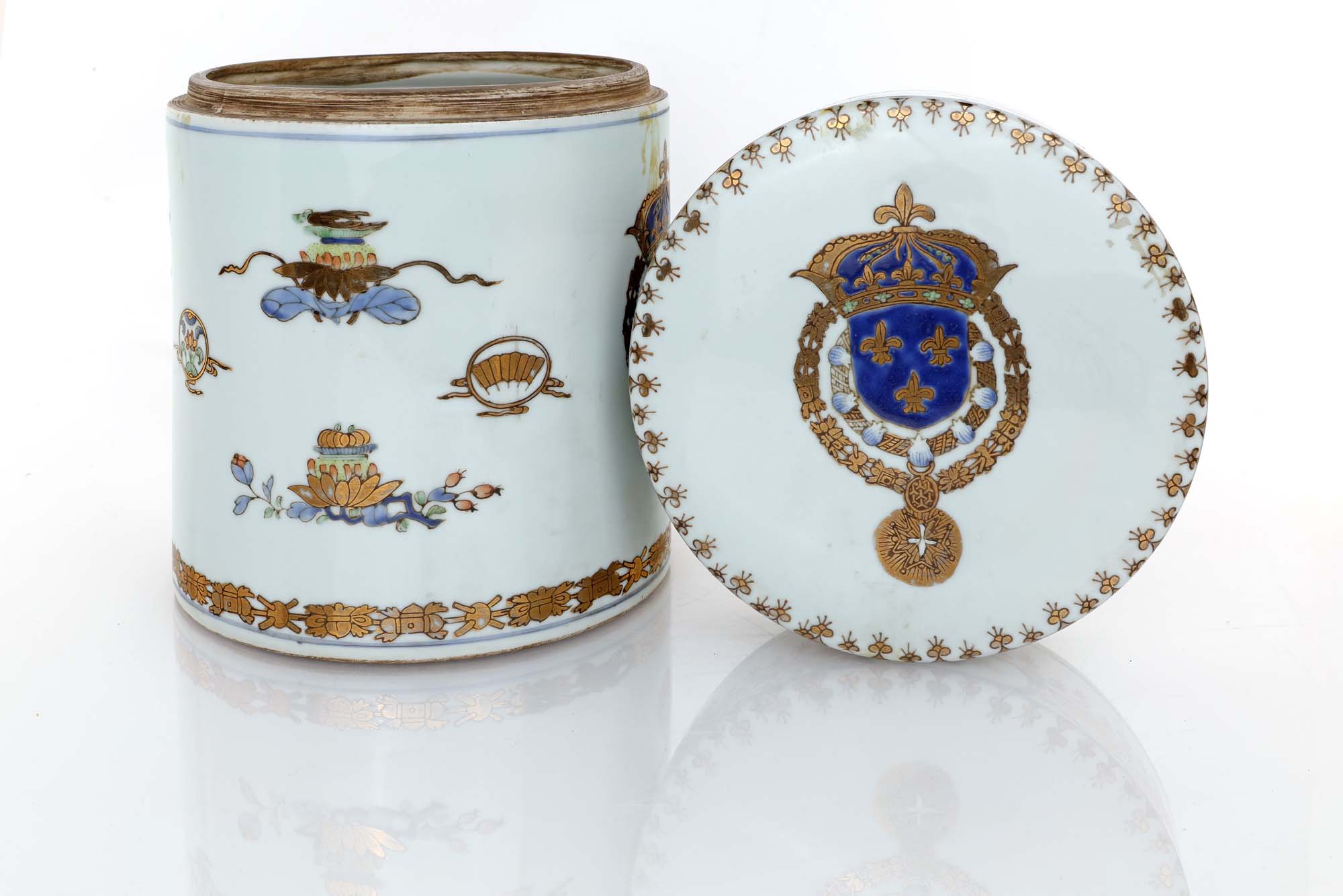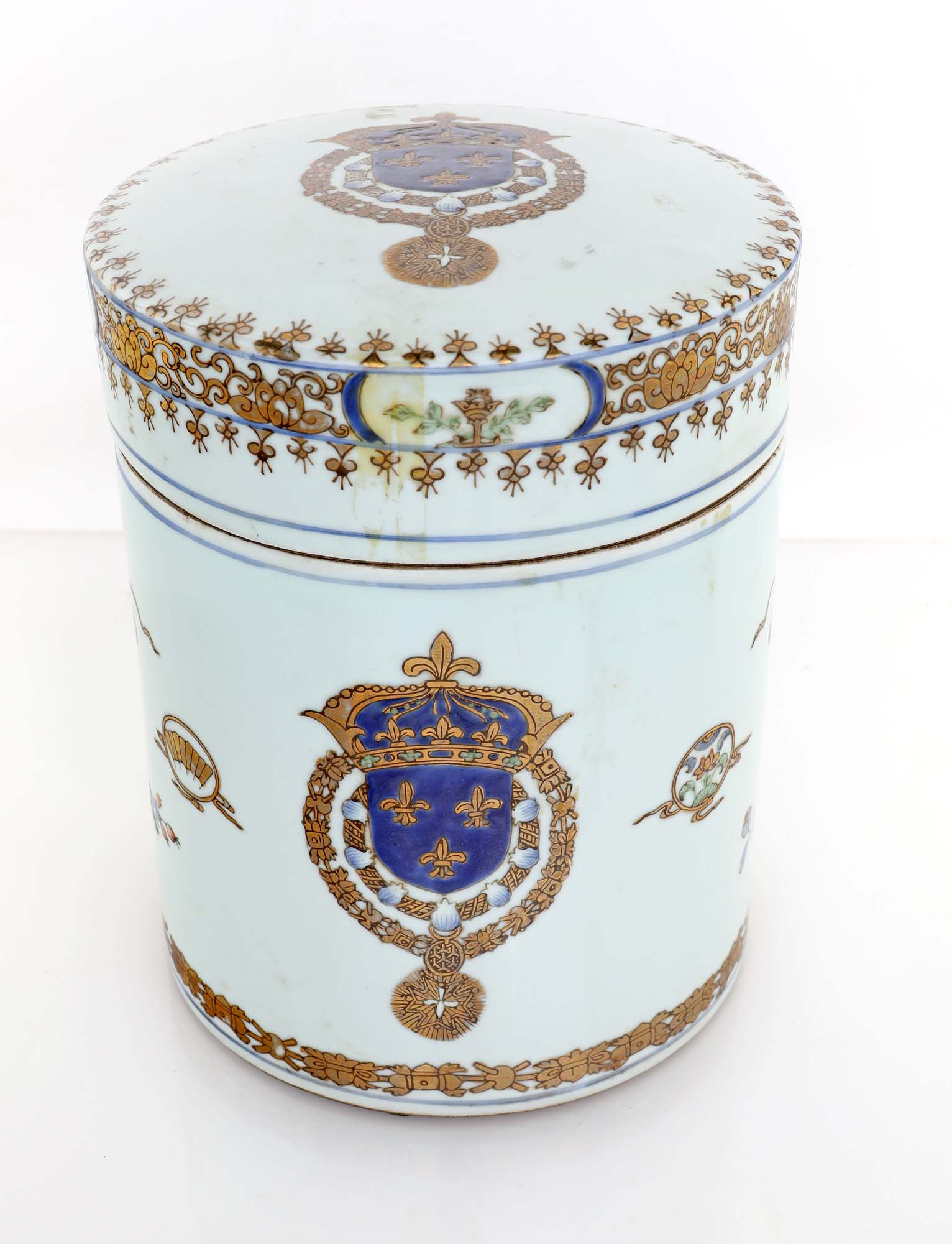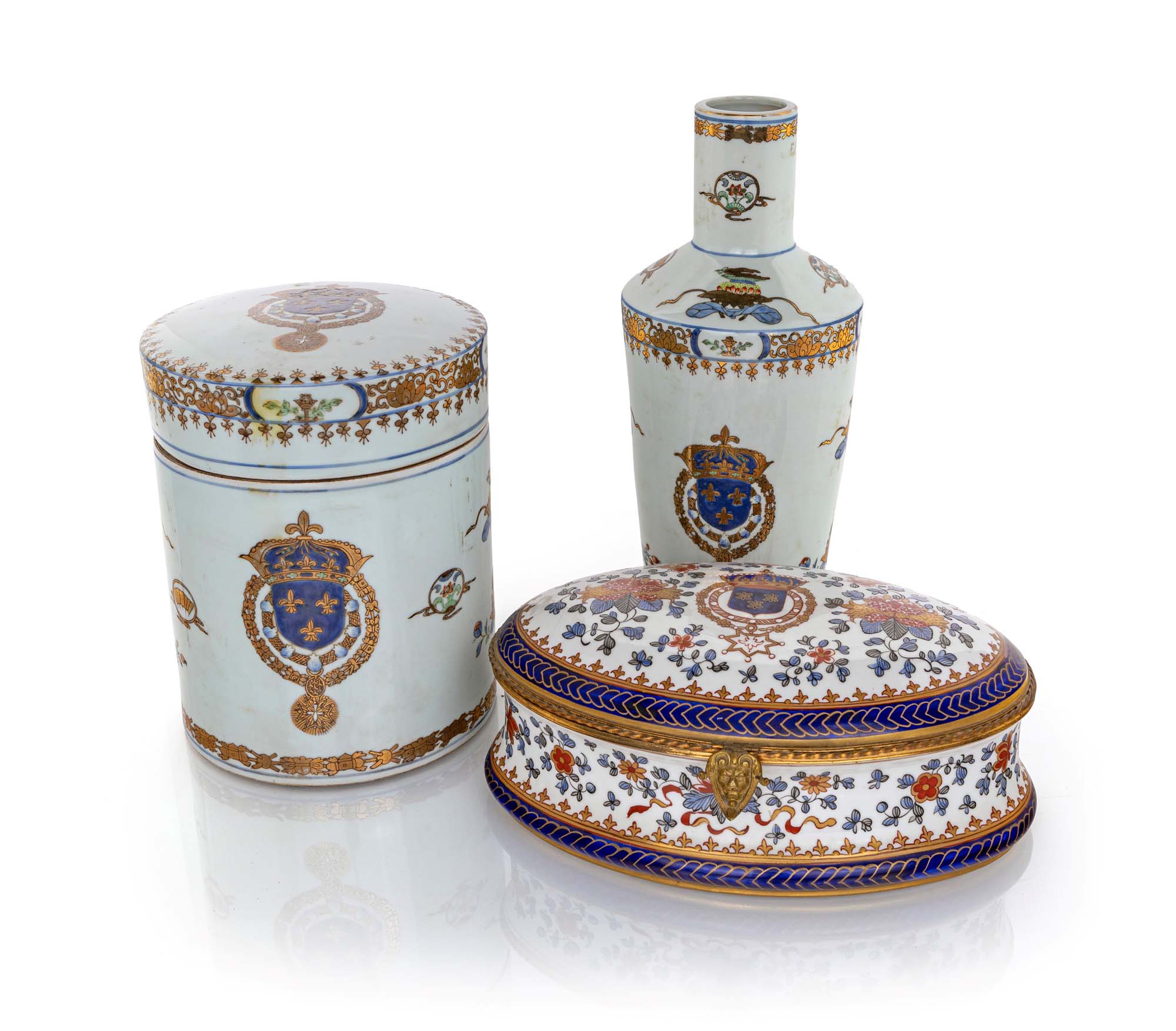 Vaso, ginger jar e scatola in porcellana, Compagnia delle Indie, Samson XIX secolo caratterizzati da stemma reale del Regno di Francia in uso dalla prima metà del Seicento fino alla fine del XVIII secolo vaso altezza cm 37 - ginger jar cm 26x20 - scatola cm 13x32x21 già Pierre Bergé & Associés, Hotel Drouot Richelieu, Parigi, 30 giugno 2021, sala 13, lotti 130, 131 e 132