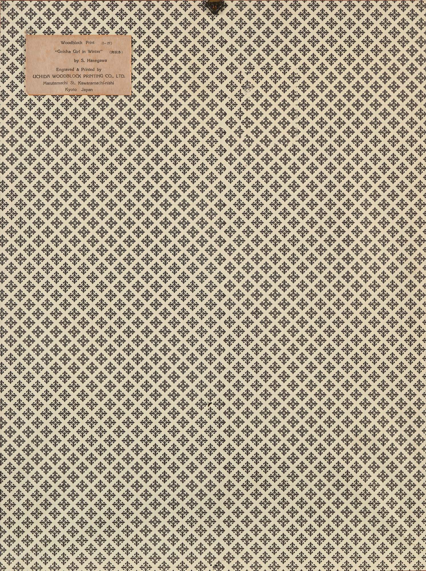 Sadanobu Hasegawa III Osaka 1881-1963 Giovane geisha in inverno Firmata sulla stampa. Al verso etichetta con iscritto Stampa xilografica di S. Hasegawa, inciso e stampato da Uchida Woodblock Printing co. ltd, Marutamachi St. Kawaramachi-nishi, Kyoto, Giappone. Non esaminata fuori dalla cornice xilografia acquerellata cm 36x24 - in cornice cm 48x36 metà del XX secolo