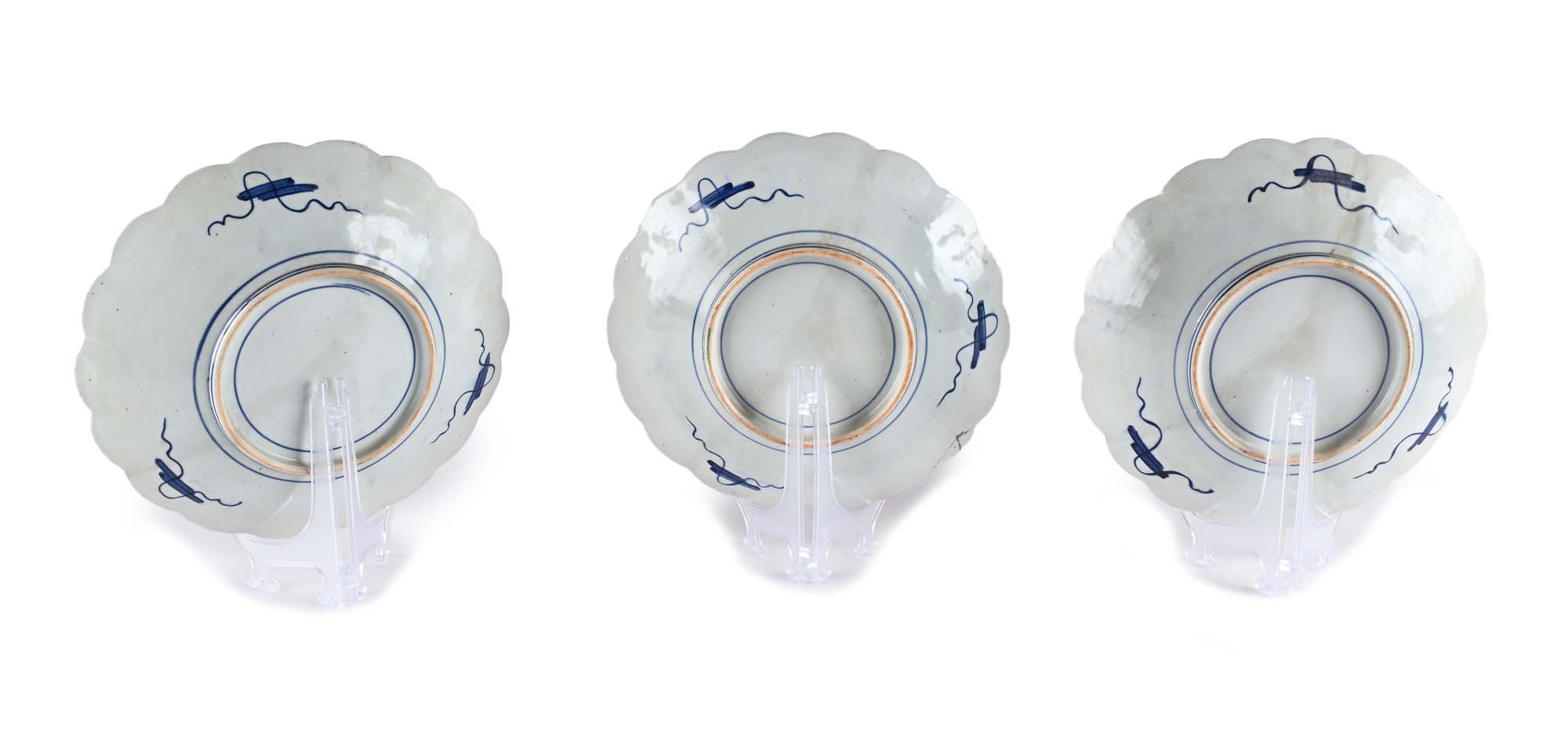 Tre piatti in porcellana Imari, Giappone, XX secolo profilo centinato...