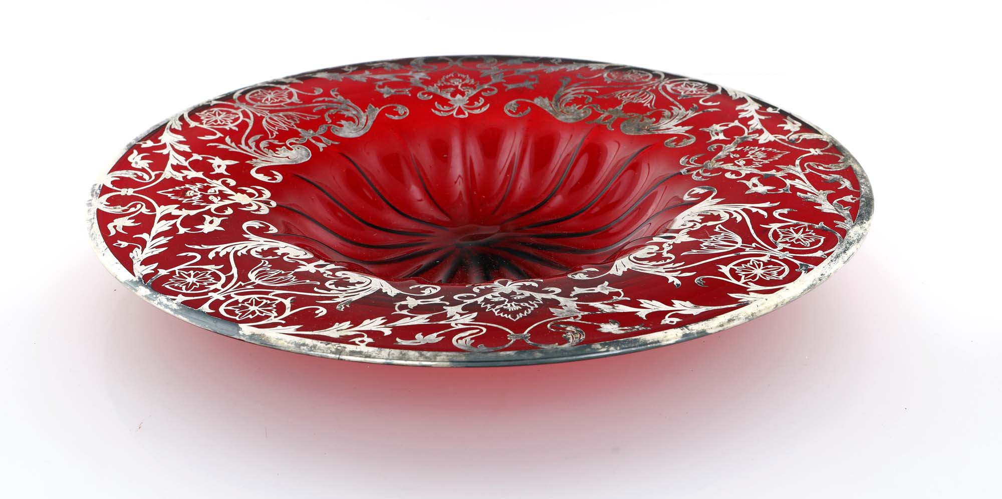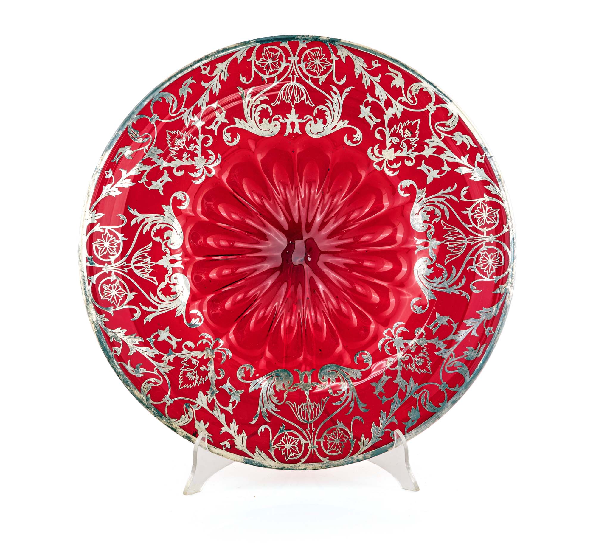 Grande piatto in vetro soffiato rosso rubino con decorazione in argento, XIX...