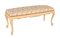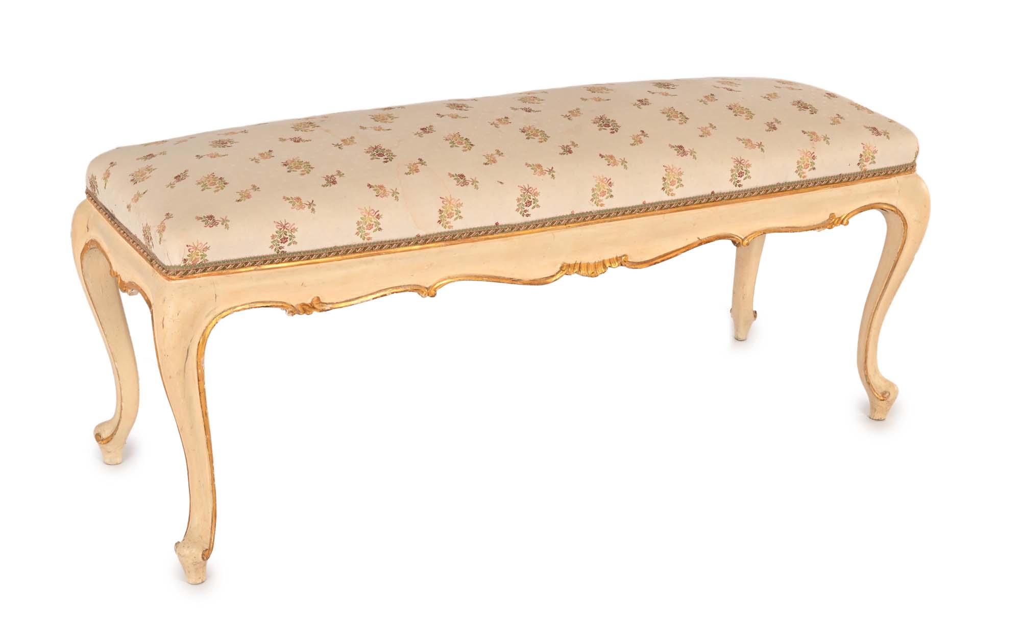 Panchetta da centro in legno laccato bianco e oro seduta rettangolare imbottita, grembiale e gambe mosse. Restauri cm 52x122x42