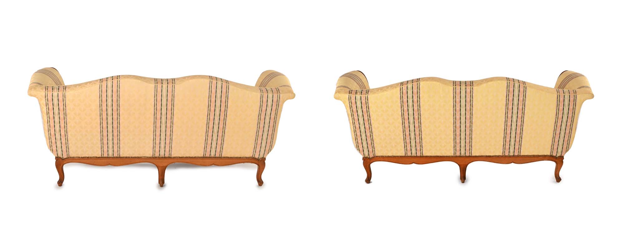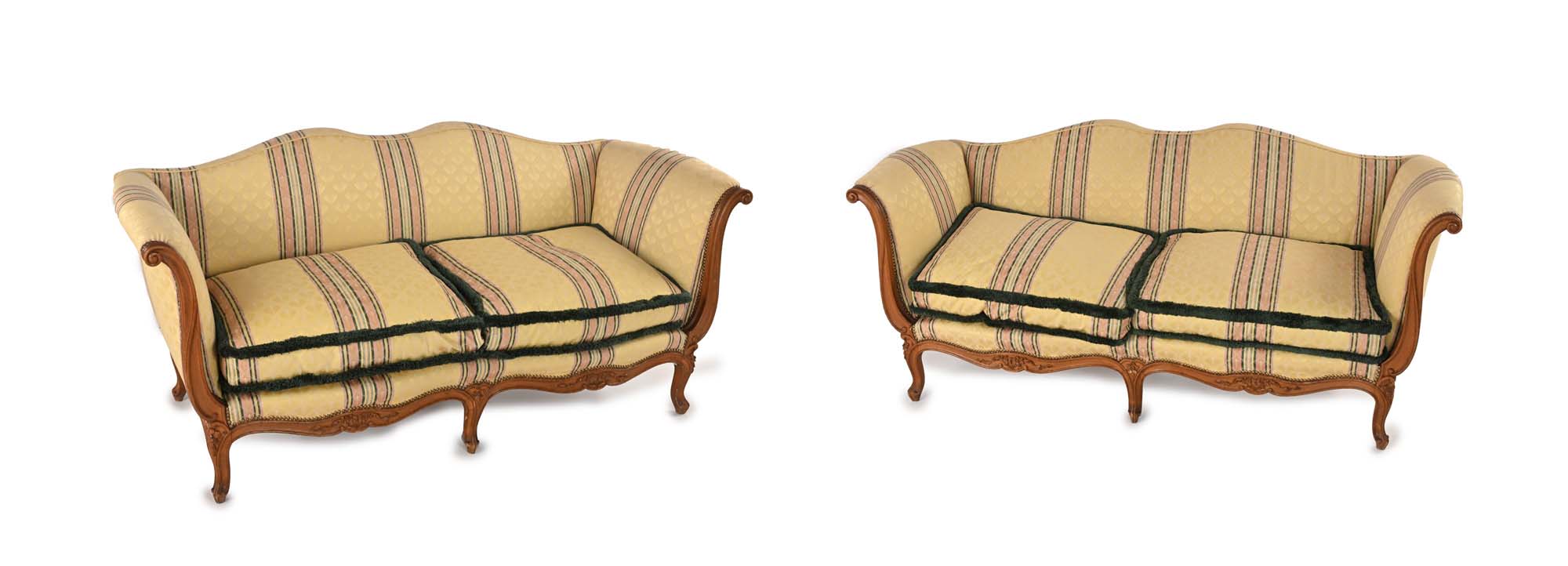 Coppia di divani in noce, interamente imbottiti e rivestiti in tessuto a righe, fine XIX/inizi XX secolo forma squadrata con profilo dello schienale ondulato, sedile sormontato da cuscini con cintura decorata da fiori intagliati; braccioli incurvati, gambe mosse cm 76x174x68