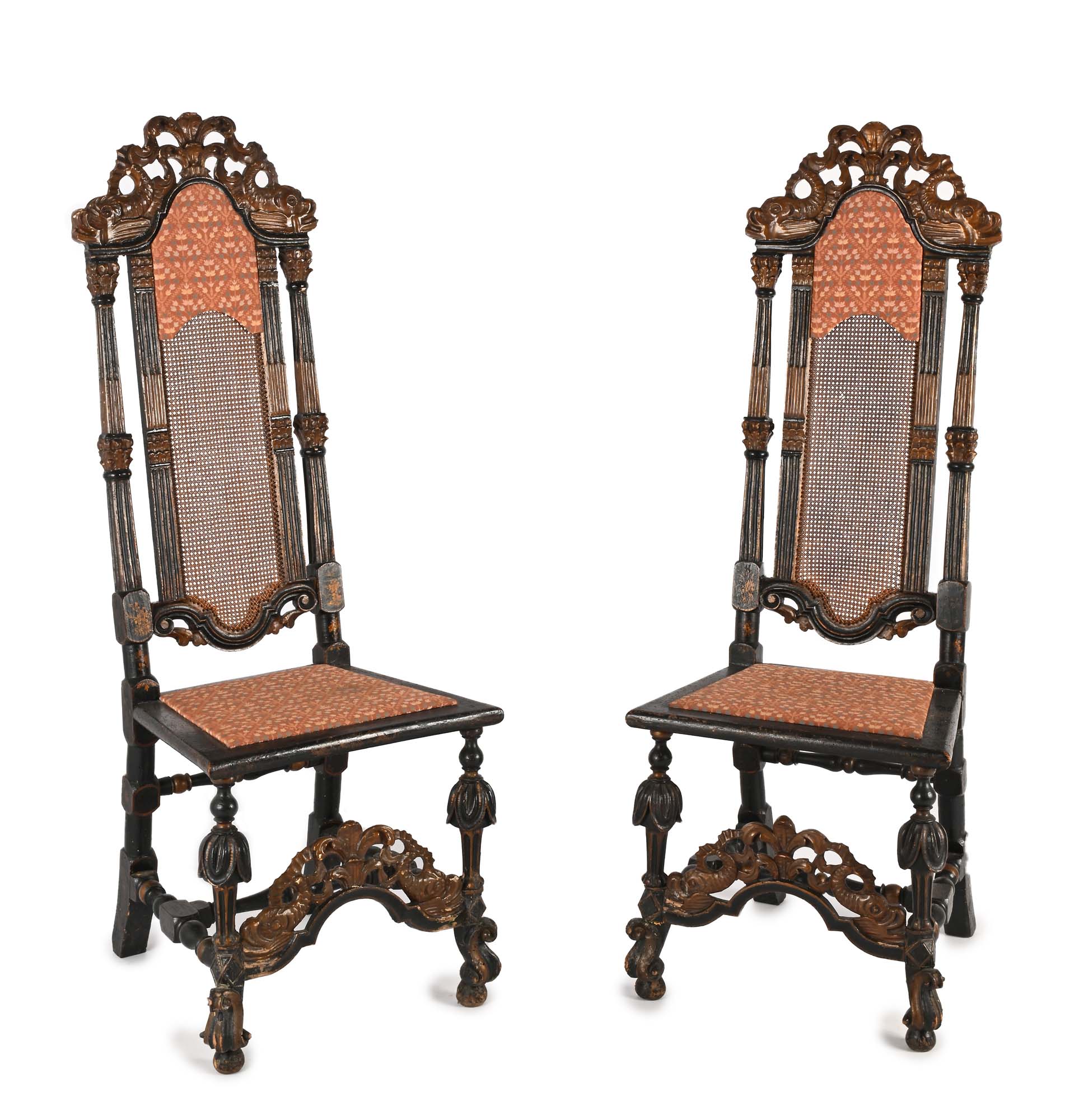 Coppia di sedie in legno dipinto, Inghilterra, XVIII secolo alti schienali con sommità caratterizzata da figure di delfino intagliate in bassorilievo e dorsale in paglia di Vienna; sedile trapezoidale con seduta in tessuto, gambe tornite riunite da traverse. Difetti e restauri cm 135x49x40