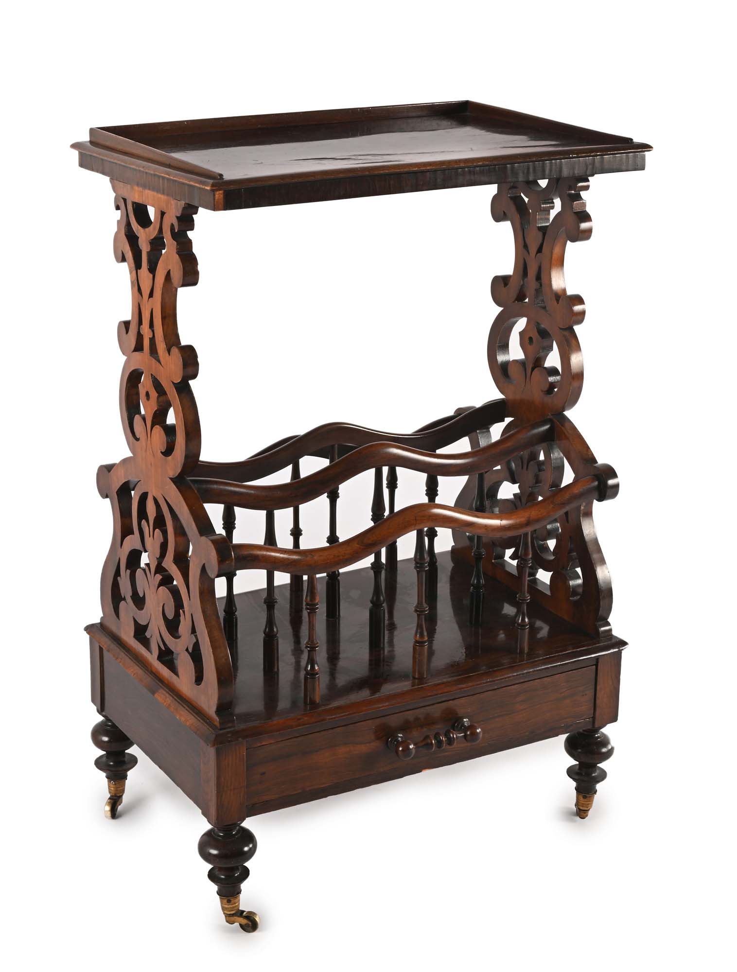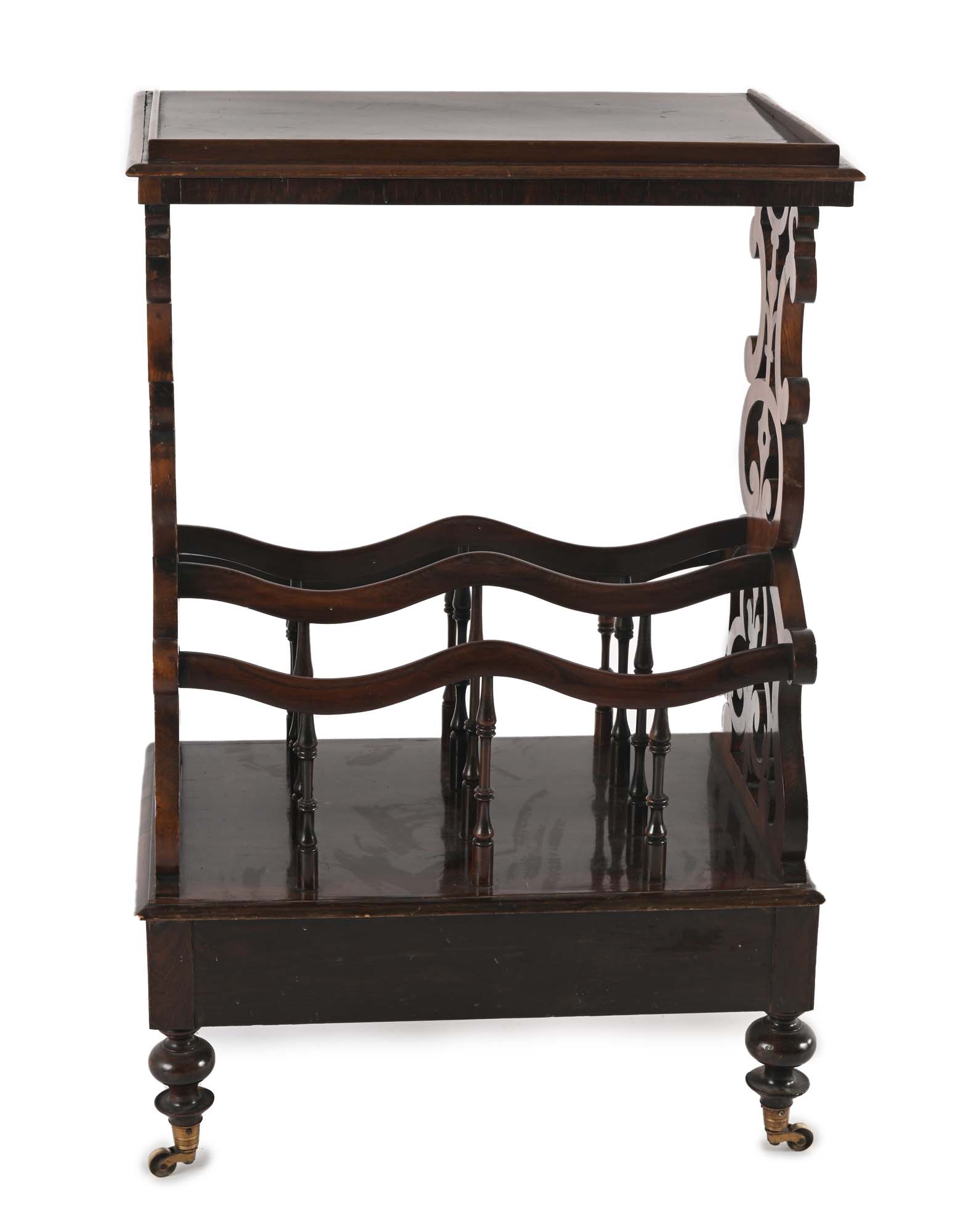 Scrivinpiedi in mogano con portariviste, Inghilterra, fine XIX secolo piano rettangolare con profilo rialzato su tre lati, scomparti inferiori a giorno ed un cassetto sottostante; poggiante su ruote cm 93x60x40