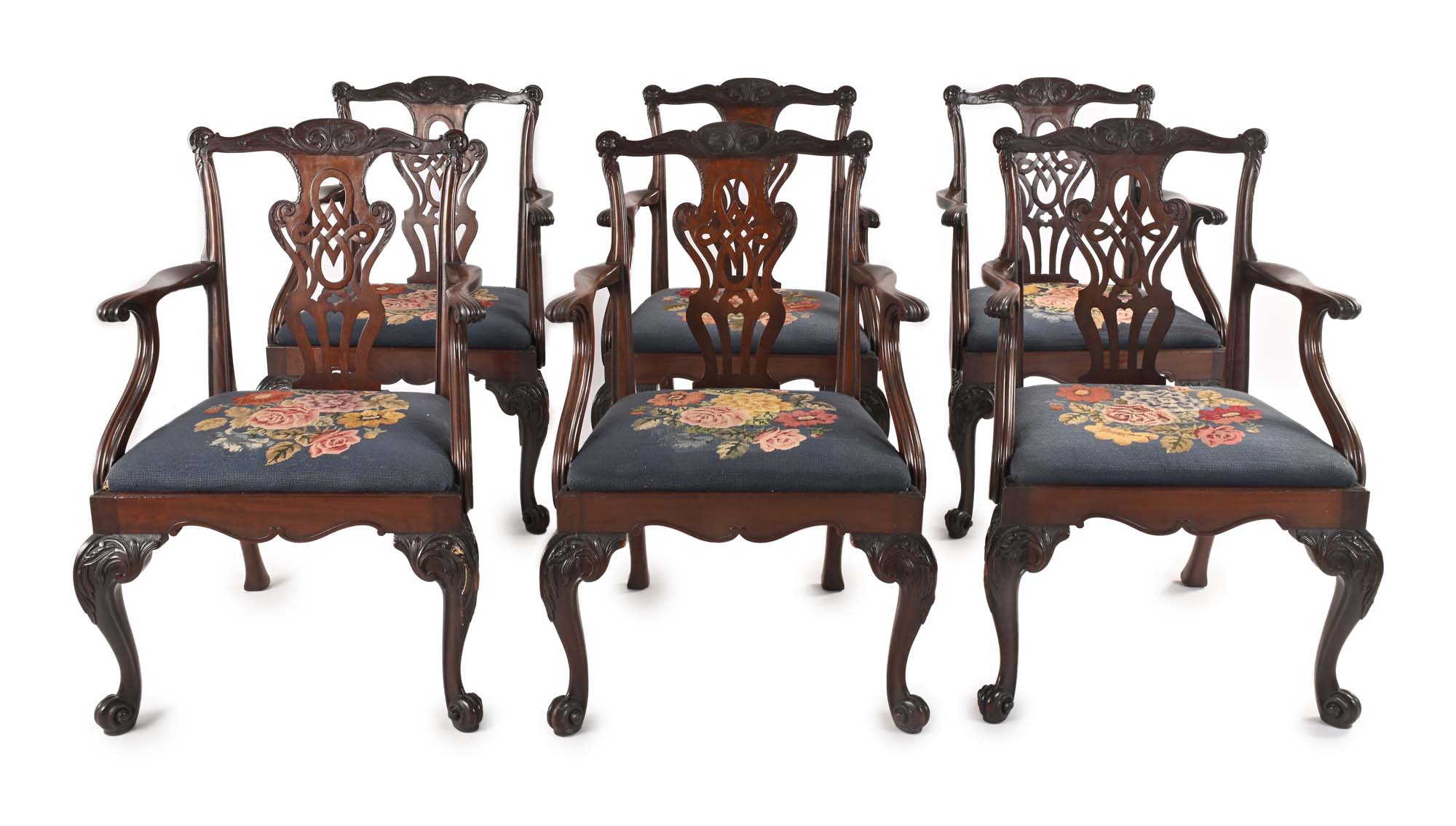 Sei poltrone in mogano stile Chippendale, Inghilterra, XX secolo schienali a giorno con dorsale traforato decorato da minuziosi rilievi intagliati, sedili imbottiti rivestiti in tessuto ricamato a piccolo punto con composizioni floreali su fondo blu, gambe anteriori sagomate terminanti ad artiglio su sfera cm 98x66x50