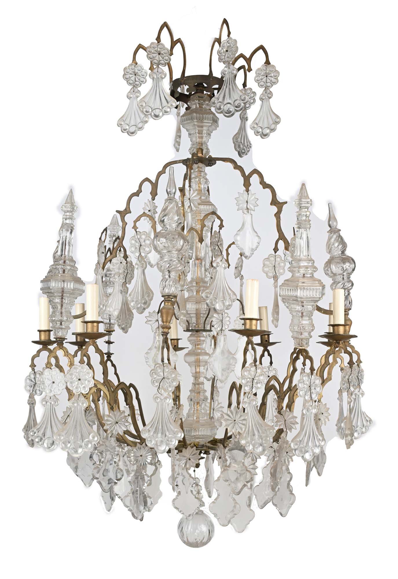 Lampadario a otto luci in ferro con pendenti in cristallo, XIX secolo bracci...