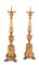 Coppia di torciere in legno dorato fusto a balaustro decorato da motivi vegetali, base cilindrica impreziosita da panneggi in rilievo, sorretta da tre piedi ferini. Difetti altezza cm 80