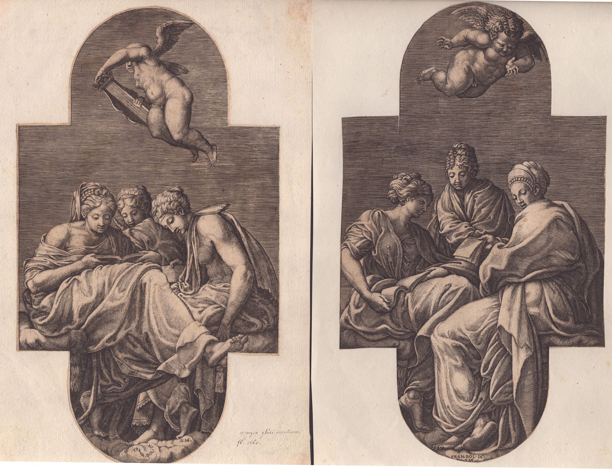 Lotto di due incisioni della serie di cinque, da Primaticcio. Bulino, 293 x 165 mm ca (cad. foglio). Tre muse e un putto con lira: stato IV su 6, Tre muse e un putto gesticolante: stato III su 4. Lewis 34 e 35.