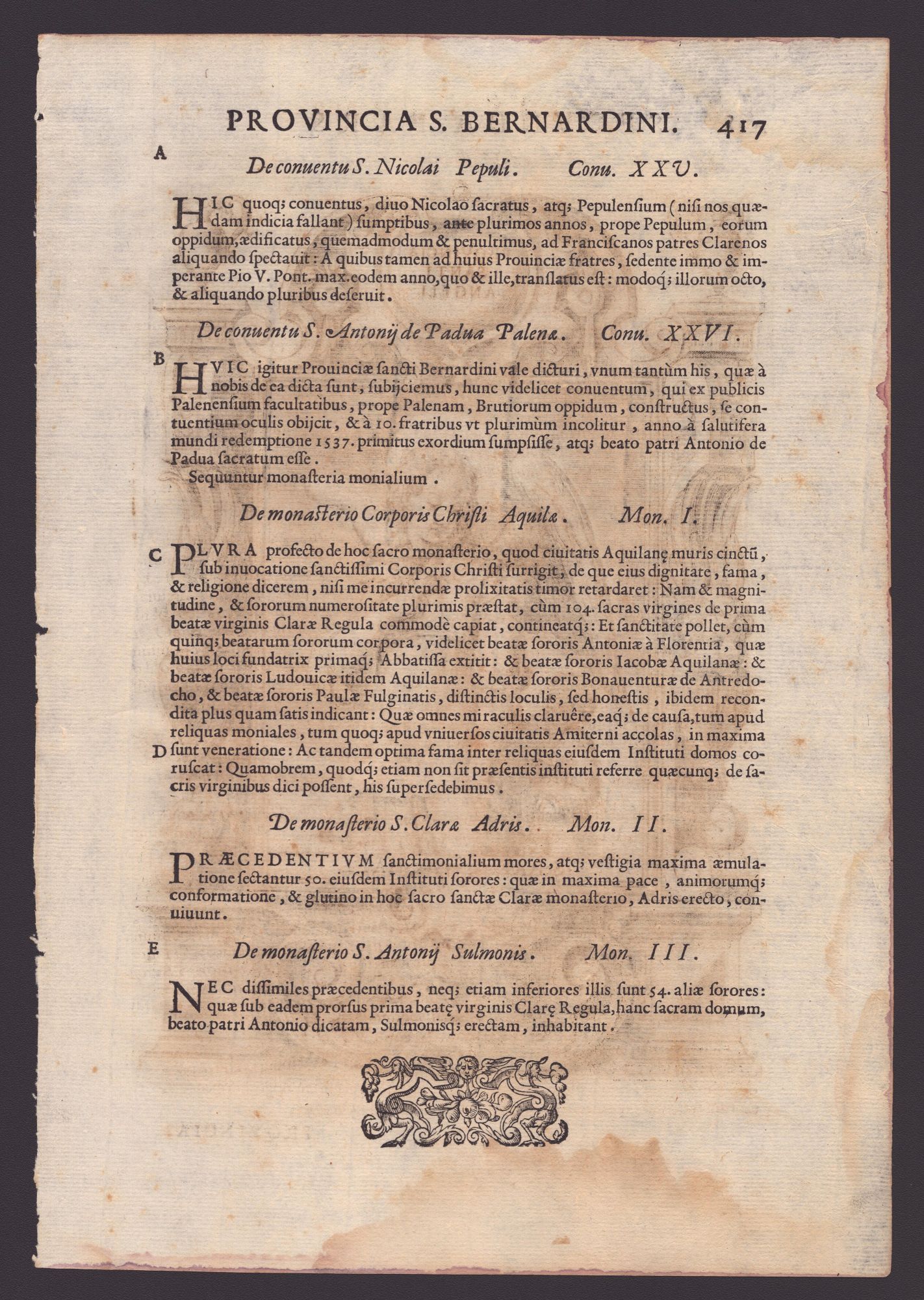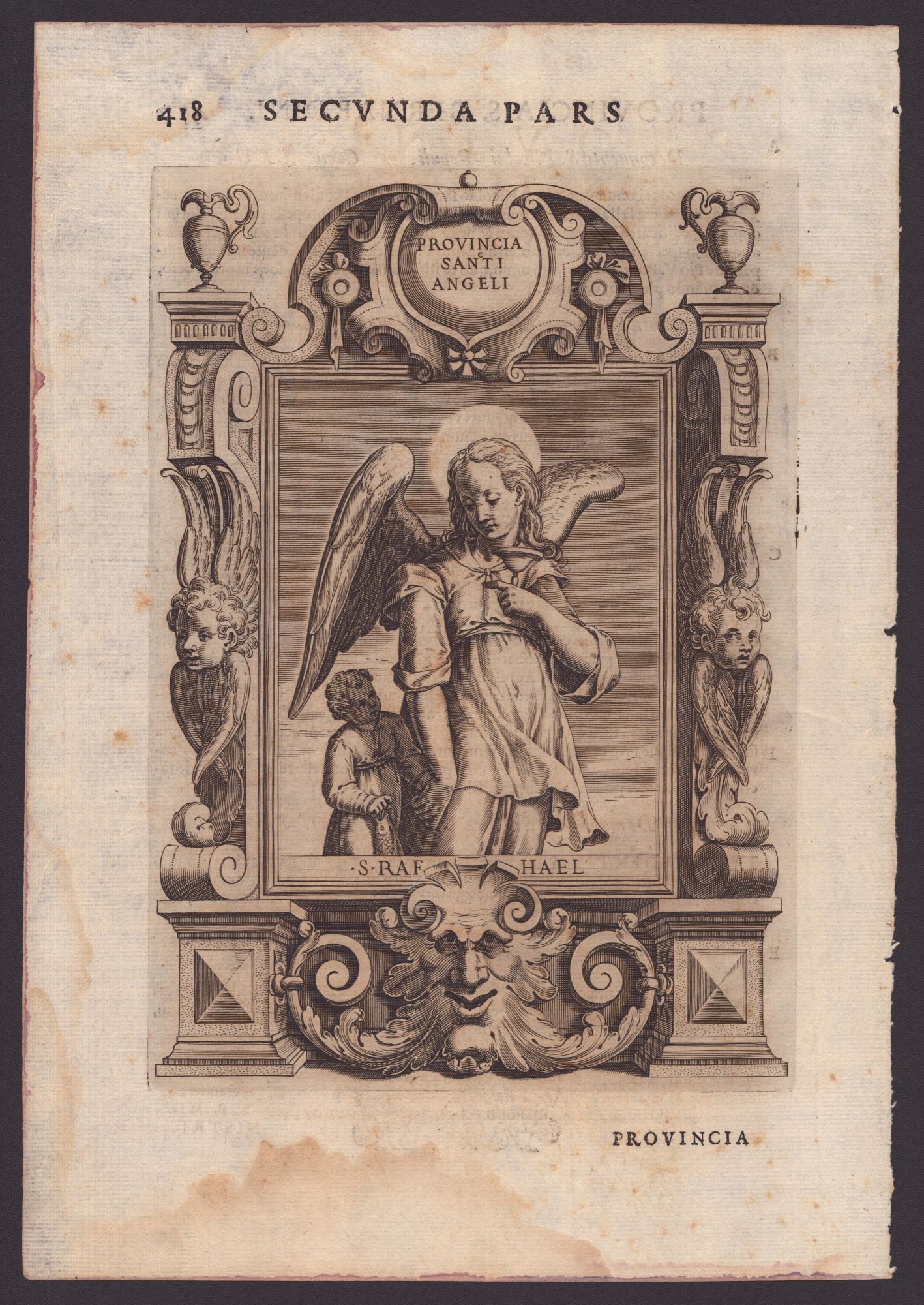 Acquaforte, 245 x 170 mm (lastra), 332 x 230 mm (foglio). Stato unico. Tratta da De Origine Seraphicae Religionis Franciscanae" di Francesco Gonzaga del 1587. De Grazia 131/3